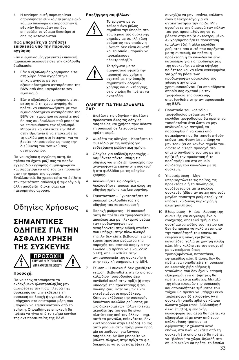 Εάν ο εξοπλισµς χρησιµοποιείται εκτς απ τη χώρα αγοράς, θα πρέπει να επικοινωνήσετε µε τον εξουσιοδοτηµένο αντιπρσωπο της B&W στη χώρα που κατοικείτε πού θα σας συµβουλέψει πού µπορείτε να επισκευάσετε τον εξοπλισµ. Μπορείτε να καλέσετε την B&W στην Βρετανία ή να επισκεφθείτε τη σελίδα µας στο Ιντερνετ για να βρείτε πληροφορίες ως προς την διεύθυνση του τοπικού σας αντιπροσώπου. Για να ισχύσει η εγγύηση αυτή, θα πρέπει να έχετε µαζί σας το παρν εγχειρίδιο εγγύησης συµπληρωµένο και σφραγισµένο απ τον αντιπρσωπ σας την ηµέρα της αγοράς. Εναλλακτικά, θα χρειαστείτε να δείξετε την πρωττυπη απδειξη ή τιµολγιο ή άλλη απδειξη ιδιοκτησίας και ηµεροµηνίας αγοράς. Οδηγίες Χρήσεως Το τρίγωνο µε το θαυµαστικ εφιστά την προσοχή του χρήστη σχετικά µε την ύπαρξη σηµαντικών οδηγιών χρήσης και συντήρησης, στις οποίες θα πρέπει να