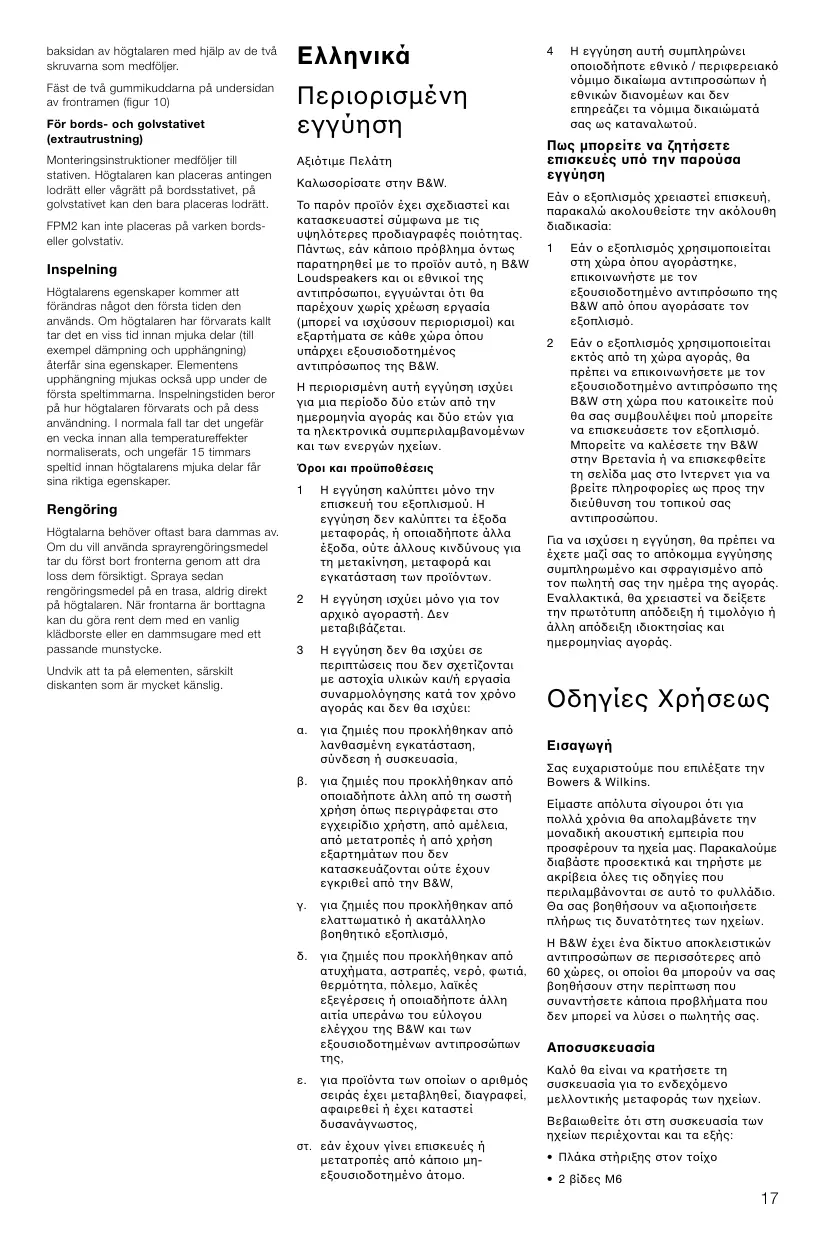 για ζηµιές που προκλήθηκαν απ λανθασµένη εγκατάσταση, σύνδεση ή συσκευασία, για ζηµιές που προκλήθηκαν απ οποιαδήποτε άλλη απ τη σωστή χρήση πως περιγράφεται στο εγχειρίδιο χρήστη, απ αµέλεια, απ µετατροπές ή απ χρήση εξαρτηµάτων που δεν κατασκευάζονται ούτε έχουν εγκριθεί απ την B&W,