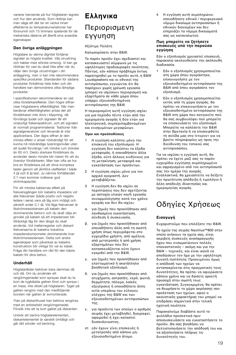 Περιορισµενη εγγυηση Καλωσορίσατε στην B&W. Το παρν προϊν έχει σχεδιαστεί και κατασκευαστεί σύµφωνα µε τις υψηλτερες προδιαγραφές ποιτητας. Πάντως, εάν κάποιο πρβληµα ντως παρατηρηθεί µε το προϊν αυτ, η B&W Loudspeakers και οι εθνικοί της αντιπρσωποι, εγγυώνται τι θα παρέχουν χωρίς χρέωση εργασία (µπορεί να ισχύσουν περιορισµοί) και εξαρτήµατα σε κάθε χώρα που υπάρχει εξουσιοδοτηµένος αντιπρσωπος της B&W. Η περιορισµένη αυτή εγγύηση ισχύει για µια περίοδο πέντε ετών απ την ηµεροµηνία αγοράς ή δύο ετών για ηλεκτρονικά, συµπεριλαµβανοµένων και ενισχυµένων µεγαφώνων. ροι και προϋποθέσεις 1