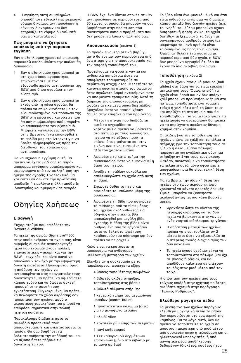 Εισαγωγή Ευχαριστούµε που επιλέξατε την Bowers & Wilkins. Τα ηχεία της σειράς Signature™800 στην οποία ανήκουν τα ηχεία σας, είναι ακριβείς συσκευές αναπαραγωγής ήχου που ενσωµατώνουν πολλές επαναστατικές – ακµη και για την B&W – τεχνικές, και είναι ικανά να αποδώσουν τον ήχο µε την υψηλτερη δυνατή πισττητα. Προκειµένου µως η απδοση των ηχείων να ανταποκρίνεται στις πραγµατικές τους δυναττητες, θα πρέπει να αφιερώσετε κάποιο χρνο και να δώσετε αρκετή προσοχή στην σωστή τους εγκατάσταση. Συγκεκριµένα, θα πρέπει να θεωρήσετε το χώρο ακρασης σαν προέκταση των ηχείων, αφού ο ακουστικς χαρακτήρας του µπορεί να επιδράσει σηµαντικά στην τελική ηχητική ποιτητα. Παρακαλούµε διαβάστε αυτ το φυλλάδιο προσεκτικά πριν αποσυσκευάσετε και εγκαταστήσετε το προϊν. Θα σας βοηθήσει να βελτιστοποιήσετε την απδοσή του και να αξιοποιήσετε πλήρως τις δυναττητές του.