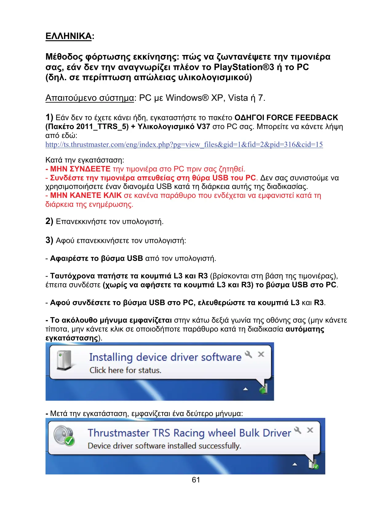 (Πακέτο 2011_TTRS_5) + Υλικολογισμικό V37 στο PC σας. Μπορείτε να κάνετε λήψη http://ts.thrustmaster.com/eng/index.php?pg=view_files&gid=1&fid=2&pid=316&cid=15 Κατά την εγκατάσταση: - ΜΗΝ ΣΥΝΔΕΕΤΕ την τιμονιέρα στο PC πριν σας ζητηθεί. - Συνδέστε την τιμονιέρα απευθείας στη θύρα USB του PC. Δεν σας συνιστούμε να χρησιμοποιήσετε έναν διανομέα USB κατά τη διάρκεια αυτής της διαδικασίας. - ΜΗΝ ΚΑΝΕΤΕ ΚΛΙΚ σε κανένα παράθυρο που ενδέχεται να εμφανιστεί κατά τη διάρκεια της ενημέρωσης.