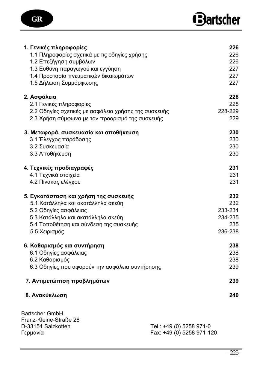 Κατά τη διάρκεια της ανακύκλωσης πρέπει να τηρούνται κατάλληλοι κρατικοί ή τοπικοί κανονισμοί. Bartscher GmbH Franz-Kleine-Straße 28 D-33154 Salzkotten