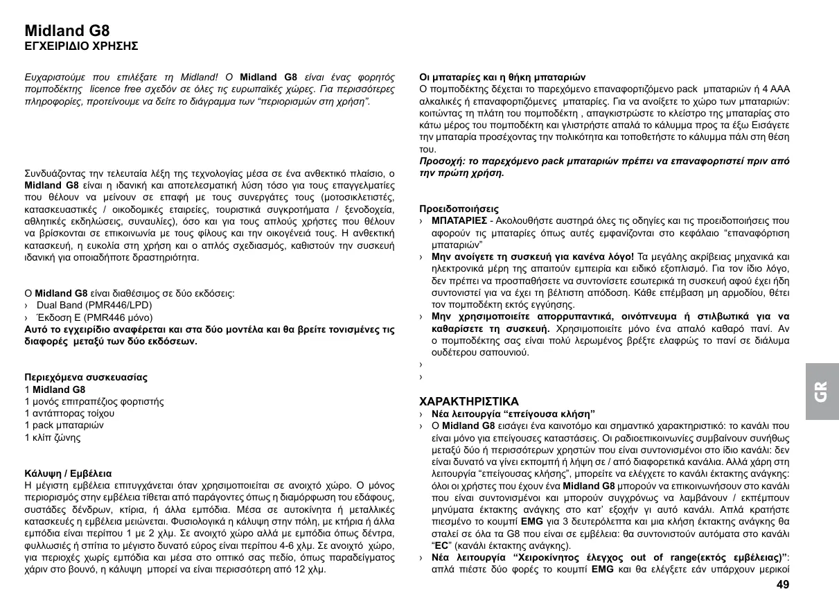 Midland G8 ΕΓΧΕΙΡΙΔΙΟ ΧΡΗΣΗΣ Ευχαριστούμε που επιλέξατε τη Midland! Ο Midland G8 είναι ένας φορητός πομποδέκτης licence free σχεδόν σε όλες τις ευρωπαϊκές χώρες. Για περισσότερες πληροφορίες, προτείνουμε να δείτε το διάγραμμα των “περιορισμών στη χρήση”. Συνδυάζοντας την τελευταία λέξη της τεχνολογίας μέσα σε ένα ανθεκτικό πλαίσιο, ο Midland G8 είναι η ιδανική και αποτελεσματική λύση τόσο για τους επαγγελματίες που θέλουν να μείνουν σε επαφή με τους συνεργάτες τους (μοτοσικλετιστές, κατασκευαστικές / οικοδομικές εταιρείες, τουριστικά συγκροτήματα / ξενοδοχεία, αθλητικές εκδηλώσεις, συναυλίες), όσο και για τους απλούς χρήστες που θέλουν να βρίσκονται σε επικοινωνία με τους φίλους και την οικογένειά τους. Η ανθεκτική κατασκευή, η ευκολία στη χρήση και ο απλός σχεδιασμός, καθιστούν την συσκευή ιδανική για οποιαδήποτε δραστηριότητα. Ο Midland G8 είναι διαθέσιμος σε δύο εκδόσεις: ›› Dual Band (PMR446/LPD) ›› Έκδοση Ε (PMR446 μόνο) Αυτό το εγχειρίδιο αναφέρεται και στα δύο μοντέλα και θα βρείτε τονισμένες τις διαφορές μεταξύ των δύο εκδόσεων. Περιεχόμενα συσκευασίας 1 Midland G8 1 μονός επιτραπέζιος φορτιστής 1 αντάπτορας τοίχου 1 pack μπαταριών 1 κλίπ ζώνης Κάλυψη / Εμβέλεια Η μέγιστη εμβέλεια επιτυγχάνεται όταν χρησιμοποιείται σε ανοιχτό χώρο. Ο μόνος περιορισμός στην εμβέλεια τίθεται από παράγοντες όπως η διαμόρφωση του εδάφους, συστάδες δένδρων, κτίρια, ή άλλα εμπόδια. Μέσα σε αυτοκίνητα ή μεταλλικές κατασκευές η εμβέλεια μειώνεται. Φυσιολογικά η κάλυψη στην πόλη, με κτήρια ή άλλα εμπόδια είναι περίπου 1 με 2 χλμ. Σε ανοιχτό χώρο αλλά με εμπόδια όπως δέντρα, φυλλωσιές ή σπίτια το μέγιστο δυνατό εύρος είναι περίπου 4-6 χλμ. Σε ανοιχτό χώρο, για περιοχές χωρίς εμπόδια και μέσα στο οπτικό σας πεδίο, όπως παραδείγματος χάριν στο βουνό, η κάλυψη μπορεί να είναι περισσότερη από 12 χλμ. Οι μπαταρίες και η θήκη μπαταριών Ο πομποδέκτης δέχεται το παρεχόμενο επαναφορτιζόμενο pack μπαταριών ή 4 AAA αλκαλικές ή επαναφορτιζόμενες μπαταρίες. Για να ανοίξετε το χώρο των μπαταριών: κοιτώντας τη πλάτη του πομποδέκτη , απαγκιστρώστε το κλείστρο της μπαταρίας στο κάτω μέρος του πομποδέκτη και γλιστρήστε απαλά το κάλυμμα προς τα έξω Εισάγετε την μπαταρία προσέχοντας την πολικότητα και τοποθετήστε το κάλυμμα πάλι στη θέση Προσοχή: το παρεχόμενο pack μπαταριών πρέπει να επαναφορτιστεί πριν από την πρώτη χρήση. Προειδοποιήσεις ›› ΜΠΑΤΑΡΙΕΣ - Ακολουθήστε αυστηρά όλες τις οδηγίες και τις προειδοποιήσεις που αφορούν τις μπαταρίες όπως αυτές εμφανίζονται στo κεφάλαιο “επαναφόρτιση ›› Μην ανοίγετε τη συσκευή για κανένα λόγο! Τα μεγάλης ακρίβειας μηχανικά και ηλεκτρονικά μέρη της απαιτούν εμπειρία και ειδικό εξοπλισμό. Για τον ίδιο λόγο, δεν πρέπει να προσπαθήσετε να συντονίσετε εσωτερικά τη συσκευή αφού έχει ήδη συντονιστεί για να έχει τη βέλτιστη απόδοση. Κάθε επέμβαση μη αρμοδίου, θέτει τον πομποδέκτη εκτός εγγύησης. ›› Μην χρησιμοποιείτε απορρυπαντικά, οινόπνευμα ή στιλβωτικά για να καθαρίσετε τη συσκευή. Χρησιμοποιείτε μόνο ένα απαλό καθαρό πανί. Αν ο πομποδέκτης σας είναι πολύ λερωμένος βρέξτε ελαφρώς το πανί σε διάλυμα ουδέτερου σαπουνιού.