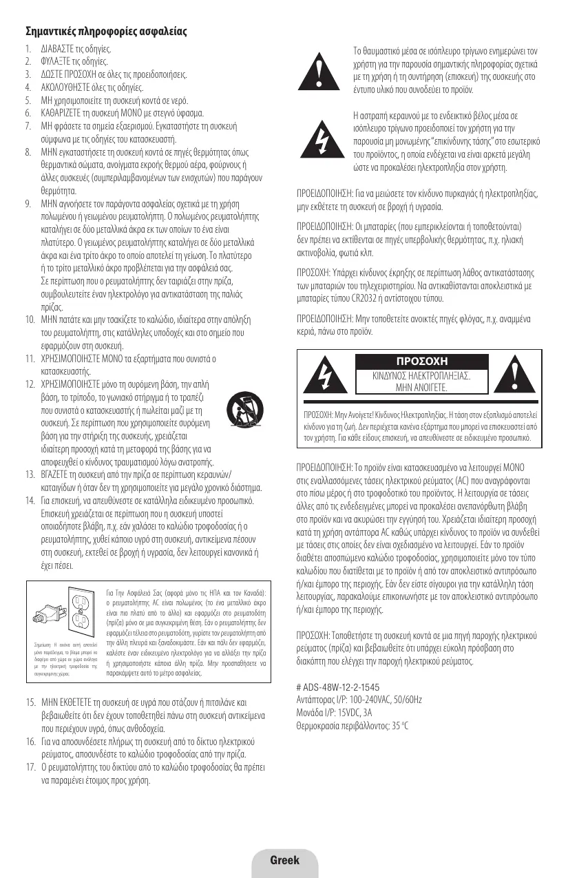 IPOEIIOIHESH: To npiov evai kataokaevauojeva vo laeioupei MONO 0tC evaalaooeves taeic nalektipkoeu peuatoc (AC) nou avaypavotvat Oto niopoc n toto ppoodotiko tou npoivtoc. H leitouyia oe taed aacn oTc evdebeiyueve cmuopei va npokalaea eanovapobwtn bbaBn 0to npoiov kai vakupooe Tny Eyyunon Tou. XpeiaZetai iaidtepn npoooxk kata n xpanavantoppa AC kubuc, unapxeyi kivduovoc to npoiov va uovbEe ie Taeeic otnoie deiv axedyiaoevo va teuoyie. Eav to npoiov diabTei anoipuuevo kaldoio ppoodooia, xnpaionoiiefe mov to tuno kalawbiou nou diatietai me to npoiov n ano to anokkeiotik ovntipoo wnt /kai eumnp TO necpioxc. Eav dev etie aiyoupi ytn kataaann taon leitouyiac, napakaoloue erikiovwnote me tv anokleiotik ovntipoooi ng /kai eumnp Tnc nepoxic.