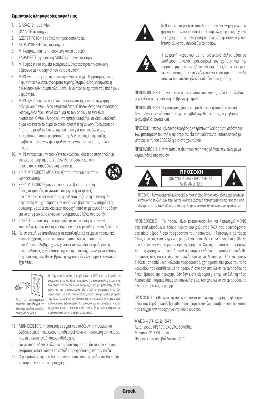 Το θαυμαστικό μέσα σε ισόπλευρο τρίγωνο ενημερώνει τον χρήστη για την παρουσία σημαντικής πληροφορίας σχετικά με τη χρήση ή τη συντήρηση (επισκευή) της συσκευής στο έντυπο υλικό που συνοδεύει το προϊόν. Η αστραπή κεραυνού με το ενδεικτικό βέλος μέσα σε ισόπλευρο τρίγωνο προειδοποιεί τον χρήστη για την παρουσία μη μονωμένης “επικίνδυνης τάσης” στο εσωτερικό του προϊόντος, η οποία ενδέχεται να είναι αρκετά μεγάλη ώστε να προκαλέσει ηλεκτροπληξία στον χρήστη. ΠΡΟΕΙΔΟΠΟΙΗΣΗ: Για να μειώσετε τον κίνδυνο πυρκαγιάς ή ηλεκτροπληξίας, μην εκθέτετε τη συσκευή σε βροχή ή υγρασία. ΠΡΟΕΙΔΟΠΟΙΗΣΗ: Οι μπαταρίες (που εμπερικλείονται ή τοποθετούνται) δεν πρέπει να εκτίθενται σε πηγές υπερβολικής θερμότητας, π.χ. ηλιακή ακτινοβολία, φωτιά κλπ. ΠΡΟΣΟΧΗ: Υπάρχει κίνδυνος έκρηξης σε περίπτωση λάθος αντικατάστασης των μπαταριών του τηλεχειριστηρίου. Να αντικαθίστανται αποκλειστικά με μπαταρίες τύπου CR2025 ή αντίστοιχου τύπου. ΠΡΟΕΙΔΟΠΟΙΗΣΗ: Μην τοποθετείτε ανοικτές πηγές φλόγας, π.χ. αναμμένα κεριά, πάνω στο προϊόν. ΠΡΟΣΟΧΗ ΚΙΝΔΥΝΟΣ ΗΛΕΚΤΡΟΠΛΗΞΙΑΣ. ΜΗΝ ΑΝΟΙΓΕΤΕ. ΠΡΟΣΟΧΗ: Μην Ανοίγετε! Κίνδυνος Ηλεκτροπληξίας. Η τάση στον εξοπλισμό αποτελεί κίνδυνο για τη ζωή. Δεν περιέχεται κανένα εξάρτημα που μπορεί να επισκευαστεί από τον χρήστη. Για κάθε είδους επισκευή, να απευθύνεστε σε ειδικευμένο προσωπικό.