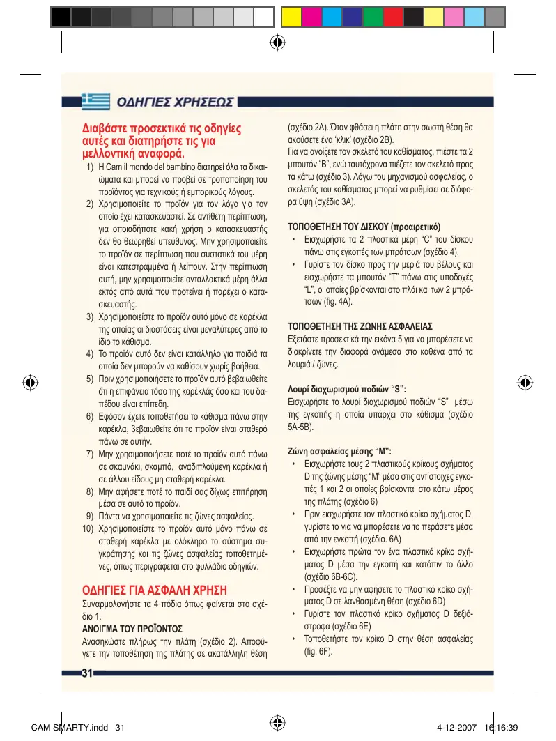 σταθερή καρέκλα με ολόκληρο το σύστημα συγκράτησης και τις ζώνες ασφαλείας τοποθετημένες, όπως περιγράφεται στο φυλλάδιο οδηγιών. ΟΔΗΓΙΕΣ ΓΙΑ ΑΣΦΑΛΗ ΧΡΗΣΗ Συναρμολογήστε τα 4 πόδια όπως φαίνεται στο σχέδιο 1. ΑΝΟΙΓΜΑ ΤΟΥ ΠΡΟΪΟΝΤΟΣ Ανασηκώστε πλήρως την πλάτη (σχέδιο 2). Αποφύγετε την τοποθέτηση της πλάτης σε ακατάλληλη θέση CAM SMARTY.indd 31 (σχέδιο 2A). Όταν φθάσει η πλάτη στην σωστή θέση θα ακούσετε ένα ‘κλικ’ (σχέδιο 2B). Για να ανοίξετε τον σκελετό του καθίσματος, πιέστε τα 2 μπουτόν “B”, ενώ ταυτόχρονα πιέζετε τον σκελετό προς τα κάτω (σχέδιο 3). Λόγω του μηχανισμού ασφαλείας, ο σκελετός του καθίσματος μπορεί να ρυθμίσει σε διάφορα ύψη (σχέδιο 3A). ΤΟΠΟΘΕΤΗΣΗ ΤΟΥ ΔΙΣΚΟΥ (προαιρετικό)