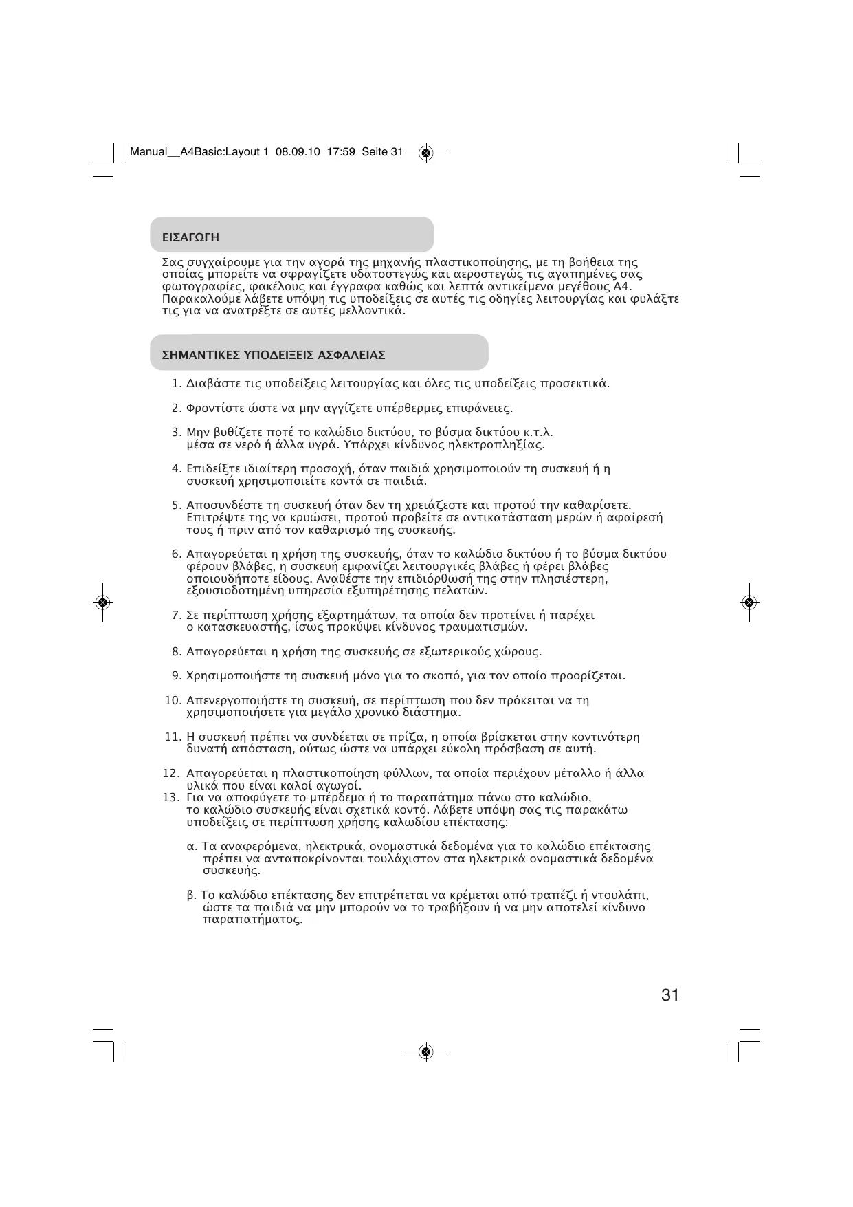 Σας συγχαίρουµε για την αγορά της µηχανής πλαστικοποίησης, µε τη βοήθεια της οποίας µπορείτε να σφραγίζετε υδατοστεγώς και αεροστεγώς τις αγαπηµένες σας φωτογραφίες, φακέλους και έγγραφα καθώς και λεπτά αντικείµενα µεγέθους Α4. Παρακαλούµε λάβετε υπόψη τις υποδείξεις σε αυτές τις οδηγίες λειτουργίας και φυλάξτε τις για να ανατρέξτε σε αυτές µελλοντικά. ΣΗΜΑΝΤΙΚΕΣ ΥΠΟΔΕΙΞΕΙΣ ΑΣΦΑΛΕΙΑΣ