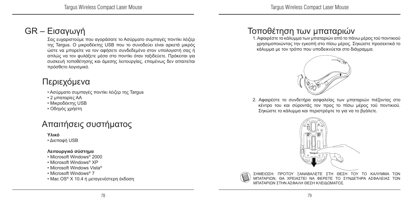 WIRELESS COMPACT LASER MOUSE - Ασύρματο ποντίκι TARGUS - Notice d'utilisation et mode d'emploi gratuit