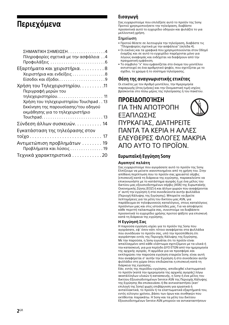 - Το σύμβολο "x" που εμφανίζεται στο όνομα του μοντέλου αντιστοιχεί σε ένα αριθμητικό ψηφίο, που σχετίζεται με το σχέδιο, το χρώμα ή το σύστημα τηλεόρασης. Θέση της αναγνωριστικής ετικέτας Οι ετικέτες με τον Αριθμό μοντέλου, την Ημερομηνία παραγωγής (έτος/μήνας) και την Ονομαστική τιμή ισχύος βρίσκονται στο πίσω μέρος της τηλεόρασης ή του πακέτου. ΠΡΟΕΙΔΟΠΟΊΗΣΗ ΓΙΑ ΤΗΝ ΑΠΟΤΡΟΠΗ ΠΥΡΚΑΓΙΑΣ, ΔΙΑΤΗΡΕΙΤΕ ΠΑΝΤΑ ΤΑ ΚΕΡΙΑ Η ΑΛΛΕΣ ΕΛΕΥΘΕΡΕΣ ΦΛΟΓΕΣ ΜΑΚΡΙΑ ΑΠΟ ΑΥΤΟ ΤΟ ΠΡΟΪΟΝ. Ευρωπαϊκή Εγγύηση Sony Αγαπητέ πελάτη Σας ευχαριστούμε που αγοράσατε αυτό το προϊόν της Sony. Ελπίζουμε να μείνετε ικανοποιημένοι από τη χρήση του. Στην απίθανη περίπτωση που το προϊόν σας χρειαστεί σέρβις (επισκευή) κατά τη διάρκεια της εγγύησης, παρακαλείστε να επικοινωνήστε με το κατάστημα αγοράς ή με ένα μέλος του δικτύου μας εξουσιοδοτημένων σέρβις (ASN) της Ευρωπαϊκής Οικονομικής Ζώνης (ΕΟΖ) ή και άλλων χωρών που αναφέρονται σ’ αυτή την εγγύηση ή στα συνοδεύοντα αυτήν φυλλάδια (Περιοχή Κάλυψης της Εγγύησης). Μπορείτε να βρείτε λεπτομέρειες για τα μέλη του δικτύου μας ASN, για παράδειγμα σε τηλεφωνικούς καταλόγους, στους καταλόγους προϊόντων μας και στις ιστοσελίδες μας. Για να αποφύγετε κάθε περιττή ταλαιπωρία σας, συνιστούμε να διαβάσετε προσεκτικά το εγχειρίδιο χρήσης προτού ψάξετε για επισκευή κατά τη διάρκεια της εγγύησης. Η Εγγύησή Σας Η παρούσα εγγύηση ισχύει για το προϊόν της Sony που αγοράσατε, εφ’ όσον κάτι τέτοιο αναφέρεται στα φυλλάδια που συνόδευαν το προϊόν σας, υπό την προϋπόθεση ότι αγοράστηκε εντός της Περιοχής Κάλυψης της Εγγύησης. Με την παρούσα, η Sony εγγυάται ότι το προϊόν είναι απαλλαγμένο από κάθε ελάττωμα σχετιζόμενο με τα υλικά ή την κατασκευή, για μια περίοδο ΔYΟ ΕΤΩN από την ημερομηνία της αρχικής αγοράς. Η αρμόδια για να προσφέρει και εκπληρώσει την παρούσα εγγύηση εταιρεία Sony, είναι αυτή που αναφέρεται σ’ αυτήν την Εγγύηση ή στο συνοδεύον αυτήν φυλλάδιο στη χώρα όπου επιδιώκεται η επισκευή κατά τη διάρκεια της εγγύησης. Εάν, εντός της περιόδου εγγύησης, αποδειχθεί ελαττωματικό το προϊόν (κατά την ημερομηνία της αρχικής αγοράς) λόγω ακατάλληλων υλικών ή κατασκευής, η Sony ή ένα μέλος του δικτύου Εξουσιοδοτημένων Service ASN της Περιοχής Κάλυψης της Εγγύησης θα επισκευάσει ή θα αντικαταστήσει (κατ’ επιλογή της Sony) χωρίς επιβάρυνση για εργατικά ή ανταλλακτικά, το προϊόν ή τα ελαττωματικά εξαρτήματά του, εντός εύλογου χρόνου, βάσει των όρων και συνθηκών που εκτίθενται παρακάτω. Η Sony και τα μέλη του δικτύου Εξουσιοδοτημένων Service ASN μπορούν να αντικαταστήσουν 2GR ελαττωματικά προϊόντα ή εξαρτήματα με νέα ή ανακυκλωμένα προϊόντα ή εξαρτήματα. Όλα τα προϊόντα και εξαρτήματα που έχουν αντικατασταθεί γίνονται ιδιοκτησία της Sony.