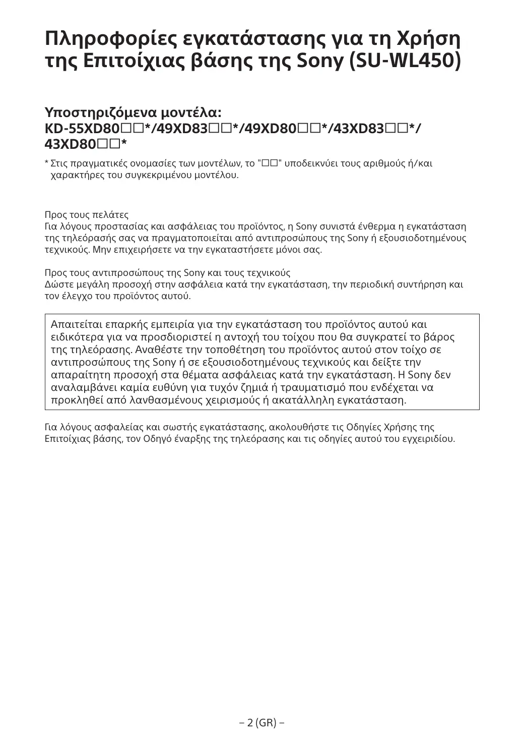 Πληροφορίες εγκατάστασης για τη Χρήση της Επιτοίχιας βάσης της Sony (SU-WL450) Υποστηριζόμενα μοντέλα: KD-55XD80*/49XD83*/49XD80*/43XD83*/ 43XD80* * Στις πραγματικές ονομασίες των μοντέλων, το "" υποδεικνύει τους αριθμούς ή/και χαρακτήρες του συγκεκριμένου μοντέλου.