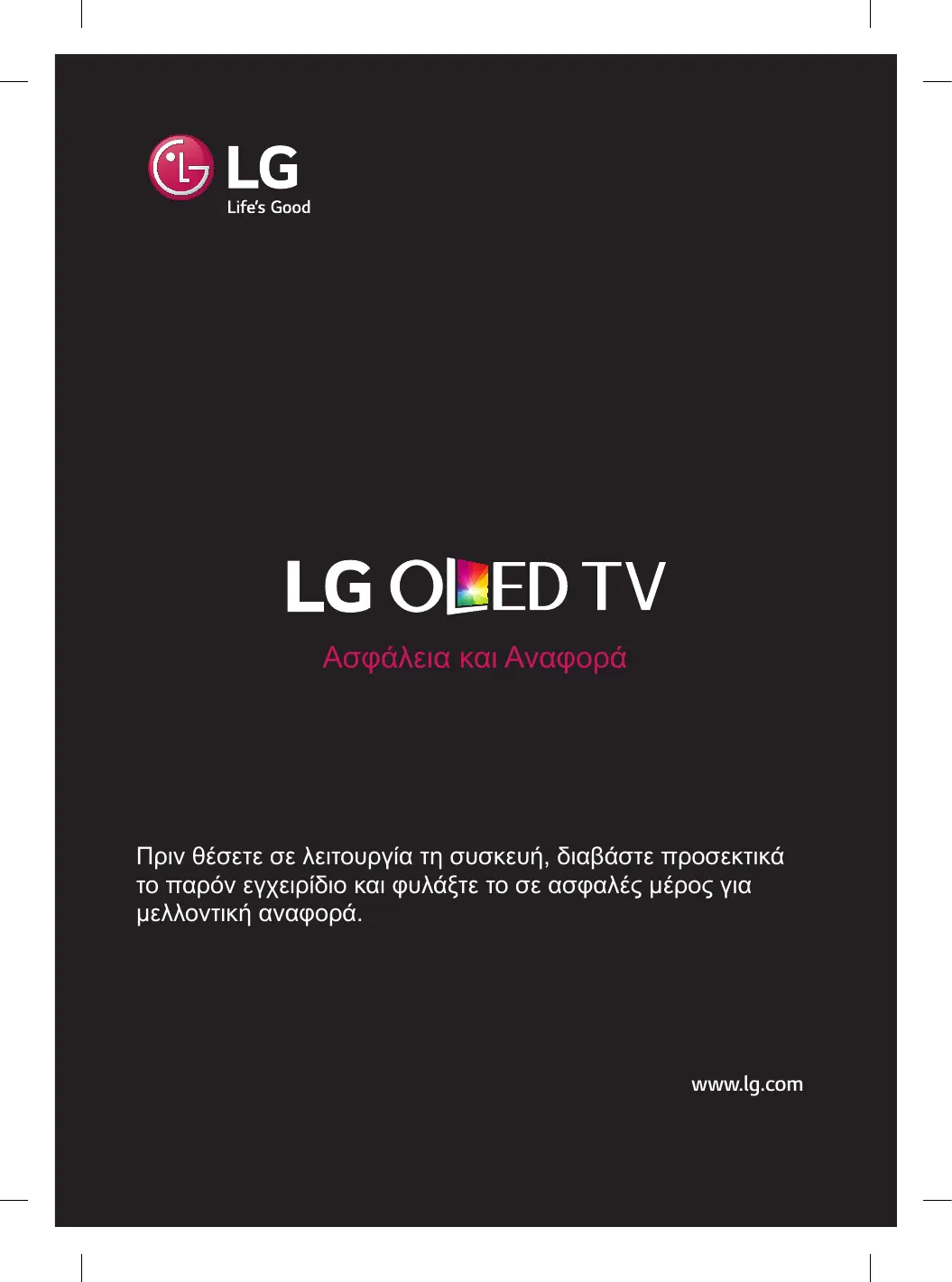 Ασφάλεια και Αναφορά Πριν θέσετε σε λειτουργία τη συσκευή, διαβάστε προσεκτικά το παρόν εγχειρίδιο και φυλάξτε το σε ασφαλές μέρος για μελλοντική αναφορά. www.lg.com Οδηγίες σχετικά με την Προτού χρησιμοποιήσετε τη συσκευή, διαβάστε προσεκτικά τις οδηγίες σχετικά με την ασφάλεια. Βεβαιωθείτε ότι έχετε συνδέσει το καλώδιο τροφοδοσίας σε γειωμένη πρίζα. (Εκτός από συσκευές οι οποίες δεν διαθέτουν γείωση.) Υπάρχει κίνδυνος ηλεκτροπληξίας ή τραυματισμού. ΠΡΟΕΙΔΟΠΟΙΗΣΗ Μην τοποθετείτε την τηλεόραση και το τηλεχειριστήριο στα παρακάτω περιβάλλοντα: