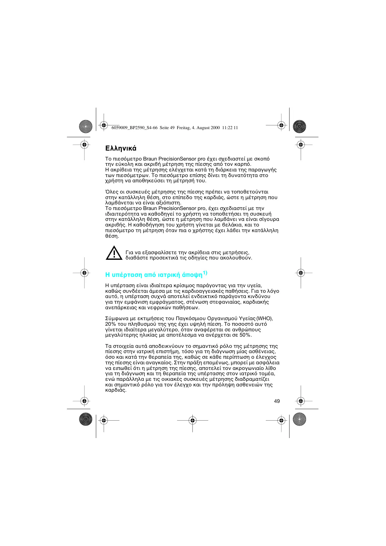6059009_BP2590_S4-66 Seite 50 Freitag, 4. August 2000 11:22 11 λοι οι παραπνω λγοι, αποδεικνουν πσο σηµαντικ εναι να διασφαλζεται η ακρβεια της µ τρησης, µ σω συσκευ"ν υψηλ"ν προδιαγραφ"ν ποιτητας και αξιοπιστας. Το πιεσµετρο Braun PrecisionSensor pro, χει σχεδιαστε µε γν"µονα αυτ το γεγονς και µε σκοπ να ικανοποιε τα ανωτ ρω απαιτητικ κριτρια. Για το λγο αυτ, στο πιεσµετρο Braun PrecisionSensor pro, χει ενσωµατωθε νας πρωτοποριακ σχεδιασµ νος ηλεκτρονικς αισθητρας, ο οποος δνει εντολ στο σστηµα τοποθ τησης του πιεσοµ τρου, "στε ο χρστης αξιπιστα να τοποθετσει τη συσκευ στο ψος της καρδις και να λβει σωστ µ τρηση. Επιπλ ον, η συσκευ ελ γχει τη θ ση του πιεσοµ τρου εκτς απ την ναρξη της µ τρησης και σε τακτ χρονικ διαστµατα κατ τη διρκεια αυτς, παρ χοντας κατ τον τρπο αυτ ακµη µεγαλτερη ασφλεια και αξιοπιστα. Αυτ το σστηµα διαρκος επιτρησης της θ σης του πιεσοµ τρου σε σχ ση µε την καρδι, εξασφαλζει επσης κατ τη διρκεια της µ τρησης της πεσης στο σπτι την µεωση των προβληµτων που δηµιουργονται λγω της ΧΥΖ. Χρη σ’ αυτ ς τις τεχνικ ς ιδιαιτερτητες το Braun PrecisionSensor pro εναι το ιδανικ πιεσµετρο, ως συµπληρωµατικ συσκευ και για Για περισστερες πληροφορες σχετικ µε την αρτηριακ πεση πως επσης και σχετικ µε τρπους διγνωσης και θεραπεας αυτς επισκεφτετε την ηλεκτρονικ σελδα της Braun στο διαδκτυο www.braun-medical.com.