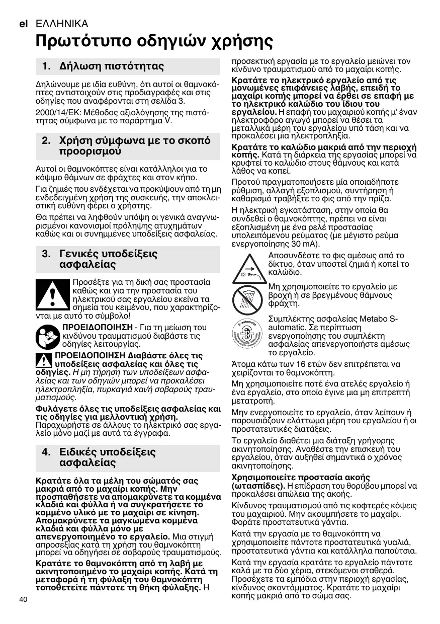 H nλεκτρική εγκατάσαση, στην έοία θα αυνδεθειο θαμνόκόπης, πρεπειν ειναι εξοπλισμένην εμ ενα ρλε ἡποσταίς uτολίπούμεου φεμματος (με εγίστο μεύμα ενεργοποίης 30 mA).