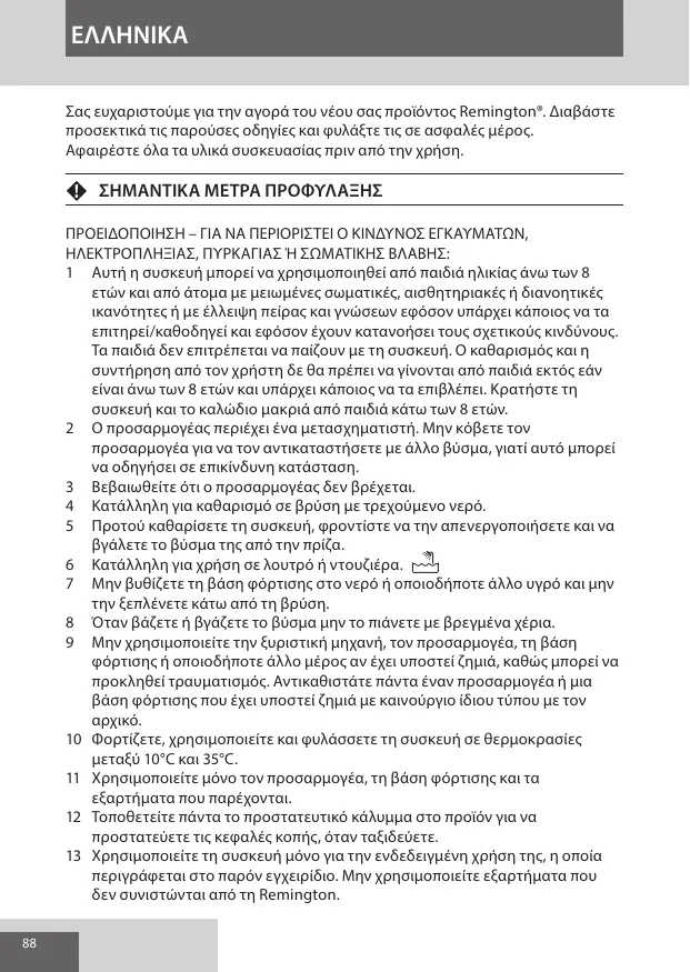 Σας ευχαριστούμε για την αγορά του νέου σας προϊόντος Remington®. Διαβάστε προσεκτικά τις παρούσες οδηγίες και φυλάξτε τις σε ασφαλές μέρος. Αφαιρέστε όλα τα υλικά συσκευασίας πριν από την χρήση. F ΣΗΜΑΝΤΙΚΑ ΜΕΤΡΑ ΠΡΟΦΥΛΑΞΗΣ ΠΡΟΕΙΔΟΠΟΙΗΣΗ – ΓΙΑ ΝΑ ΠΕΡΙΟΡΙΣΤΕΙ Ο ΚΙΝΔΥΝΟΣ ΕΓΚΑΥΜΑΤΩΝ, ΗΛΕΚΤΡΟΠΛΗΞΙΑΣ, ΠΥΡΚΑΓΙΑΣ Ή ΣΩΜΑΤΙΚΗΣ ΒΛΑΒΗΣ: 1 Αυτή η συσκευή μπορεί να χρησιμοποιηθεί από παιδιά ηλικίας άνω των 8 ετών και από άτομα με μειωμένες σωματικές, αισθητηριακές ή διανοητικές ικανότητες ή με έλλειψη πείρας και γνώσεων εφόσον υπάρχει κάποιος να τα επιτηρεί/καθοδηγεί και εφόσον έχουν κατανοήσει τους σχετικούς κινδύνους. Τα παιδιά δεν επιτρέπεται να παίζουν με τη συσκευή. Ο καθαρισμός και η συντήρηση από τον χρήστη δε θα πρέπει να γίνονται από παιδιά εκτός εάν είναι άνω των 8 ετών και υπάρχει κάποιος να τα επιβλέπει. Κρατήστε τη συσκευή και το καλώδιο μακριά από παιδιά κάτω των 8 ετών. 2 Ο προσαρμογέας περιέχει ένα μετασχηματιστή. Μην κόβετε τον προσαρμογέα για να τον αντικαταστήσετε με άλλο βύσμα, γιατί αυτό μπορεί να οδηγήσει σε επικίνδυνη κατάσταση. 3 Βεβαιωθείτε ότι ο προσαρμογέας δεν βρέχεται. 4 Κατάλληλη για καθαρισμό σε βρύση με τρεχούμενο νερό. 5 Προτού καθαρίσετε τη συσκευή, φροντίστε να την απενεργοποιήσετε και να βγάλετε το βύσμα της από την πρίζα. 6 Κατάλληλη για χρήση σε λουτρό ή ντουζιέρα. 7 Μην βυθίζετε τη βάση φόρτισης στο νερό ή οποιοδήποτε άλλο υγρό και μην την ξεπλένετε κάτω από τη βρύση. 8 Όταν βάζετε ή βγάζετε το βύσμα μην το πιάνετε με βρεγμένα χέρια. 9 Μην χρησιμοποιείτε την ξυριστική μηχανή, τον προσαρμογέα, τη βάση φόρτισης ή οποιοδήποτε άλλο μέρος αν έχει υποστεί ζημιά, καθώς μπορεί να προκληθεί τραυματισμός. Αντικαθιστάτε πάντα έναν προσαρμογέα ή μια βάση φόρτισης που έχει υποστεί ζημιά με καινούργιο ίδιου τύπου με τον 10 Φορτίζετε, χρησιμοποιείτε και φυλάσσετε τη συσκευή σε θερμοκρασίες μεταξύ 10°C και 35°C. 11 Χρησιμοποιείτε μόνο τον προσαρμογέα, τη βάση φόρτισης και τα εξαρτήματα που παρέχονται. 12 Τοποθετείτε πάντα το προστατευτικό κάλυμμα στο προϊόν για να προστατεύετε τις κεφαλές κοπής, όταν ταξιδεύετε. 13 Χρησιμοποιείτε τη συσκευή μόνο για την ενδεδειγμένη χρήση της, η οποία περιγράφεται στο παρόν εγχειρίδιο. Μην χρησιμοποιείτε εξαρτήματα που δεν συνιστώνται από τη Remington.