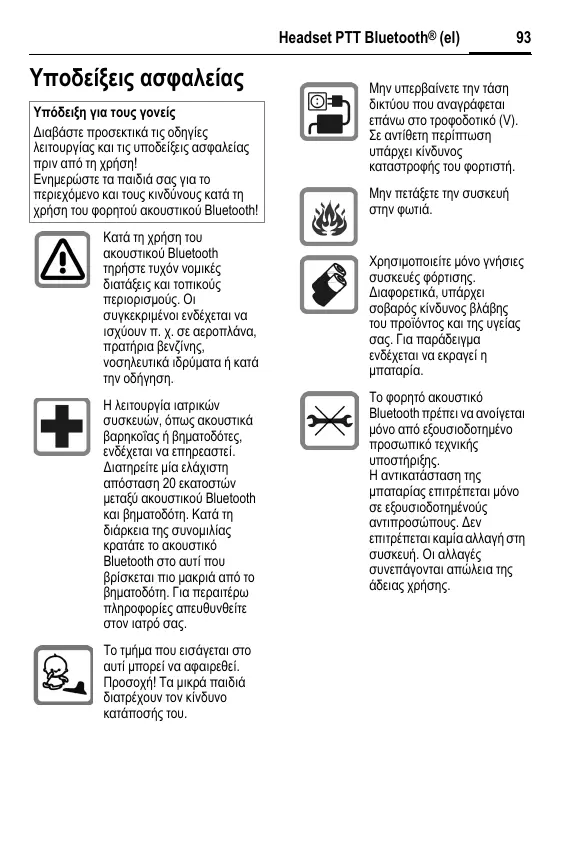 λειτουργίας και τις υποδείξεις ασφαλείας πριν από τη χρήση! Ενηµερώστε τα παιδιά σας για το περιεχόµενο και τους κινδύνους κατά τη χρήση του φορητού ακουστικού Bluetooth! Κατά τη χρήση του ακουστικού Bluetooth τηρήστε τυχόν νοµικές διατάξεις και τοπικούς περιορισµούς. Οι συγκεκριµένοι ενδέχεται να ισχύουν π. χ. σε αεροπλάνα, πρατήρια βενζίνης, νοσηλευτικά ιδρύµατα ή κατά την οδήγηση. Η λειτουργία ιατρικών συσκευών, όπως ακουστικά βαρηκοΐας ή βηµατοδότες, ενδέχεται να επηρεαστεί. ∆ιατηρείτε µία ελάχιστη απόσταση 20 εκατοστών µεταξύ ακουστικού Bluetooth και βηµατοδότη. Κατά τη διάρκεια της συνοµιλίας κρατάτε το ακουστικό Bluetooth στο αυτί που βρίσκεται πιο µακριά από το βηµατοδότη. Για περαιτέρω πληροφορίες απευθυνθείτε στον ιατρό σας. Το τµήµα που εισάγεται στο αυτί µπορεί να αφαιρεθεί. Προσοχή! Τα µικρά παιδιά διατρέχουν τον κίνδυνο κατάποσής του.