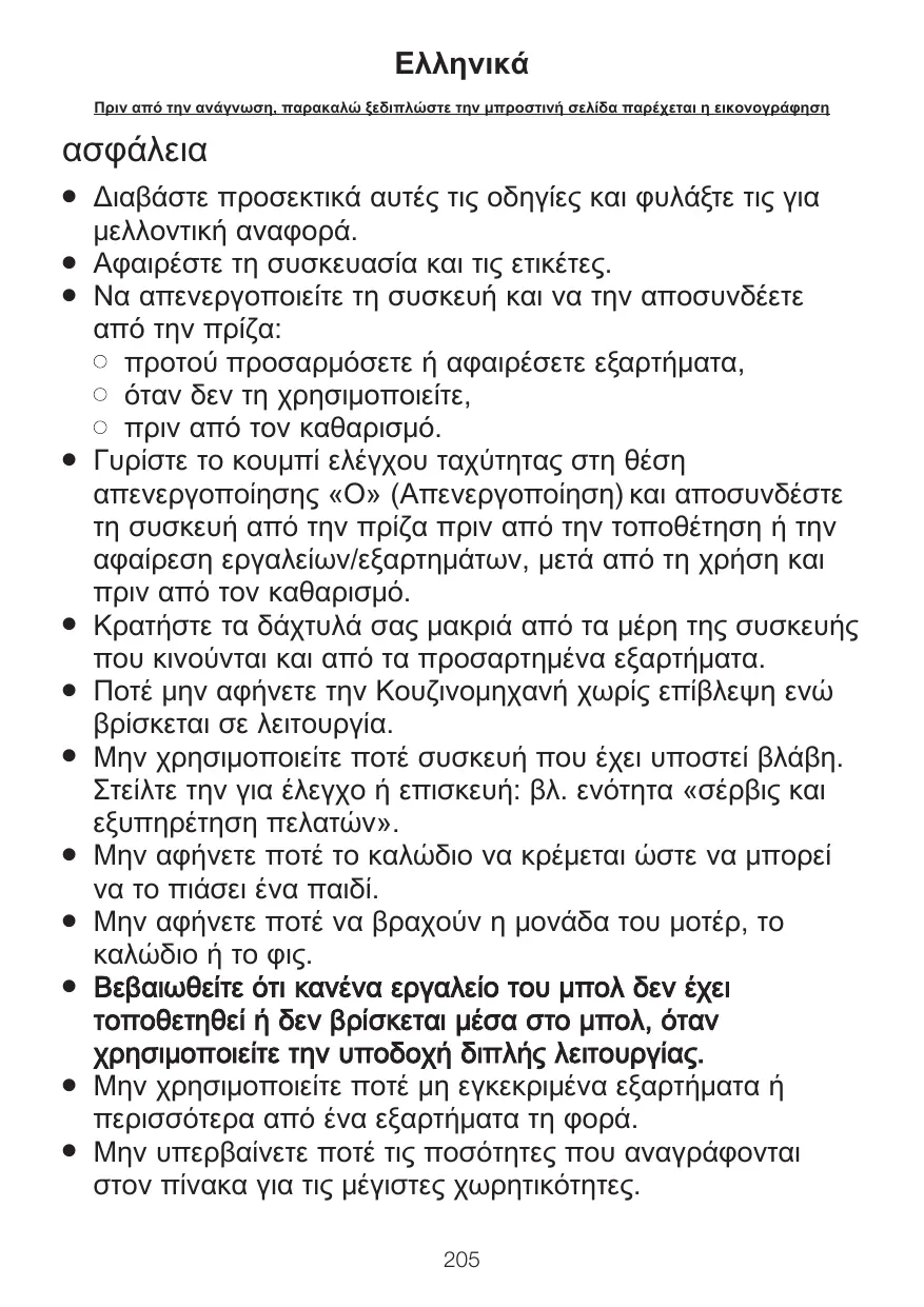 *iab1rse pqorejsij1 ats2y siy B7:648E jai utk1nse siy cia ?8>>B@G<=3 amauoq1. Auaiq2rse sg FHF=8H5F45 jai siy esij2sey. .5 5C8@8D6BCB<84G8 G: FHF=8H3 =5< @5 G:@ 5CBFH@728G8 5CN G:@ CD495: l CDoGBO CDBF5D?NF8G8 3 5I5<D2F8G8 8A5DG3?5G5, l NG5@ 78@ G: JD:F<?BCB<84G8, l CD<@ 5CN GB@ =5;5D<F?N. Γυρίστε το κουμπί ελέγχου ταχύτητας στη θέση απενεργοποίησης «O» (Απενεργοποίηση) και αποσυνδέστε τη συσκευή από την πρίζα πριν από την τοποθέτηση ή την αφαίρεση εργαλείων/εξαρτημάτων, μετά από τη χρήση και πριν από τον καθαρισμό. Κρατήστε τα δάχτυλά σας μακριά από τα μέρη της συσκευής που κινούνται και από τα προσαρτημένα εξαρτήματα. Ποτέ μην αφήνετε την Κουζινομηχανή χωρίς επίβλεψη ενώ βρίσκεται σε λειτουργία. Μην χρησιμοποιείτε ποτέ συσκευή που έχει υποστεί βλάβη. Στείλτε την για έλεγχο ή επισκευή: βλ. ενότητα «σέρβις και εξυπηρέτηση πελατών». Μην αφήνετε ποτέ το καλώδιο να κρέμεται ώστε να μπορεί να το πιάσει ένα παιδί. Μην αφήνετε ποτέ να βραχούν η μονάδα του μοτέρ, το καλώδιο ή το φις. Βεβαιωθείτε ότι κανένα εργαλείο του μπολ δεν έχει τοποθετηθεί ή δεν βρίσκεται μέσα στο μπολ, όταν χρησιμοποιείτε την υποδοχή διπλής λειτουργίας. Μην χρησιμοποιείτε ποτέ μη εγκεκριμένα εξαρτήματα ή περισσότερα από ένα εξαρτήματα τη φορά. Μην υπερβαίνετε ποτέ τις ποσότητες που αναγράφονται στον πίνακα για τις μέγιστες χωρητικότητες.