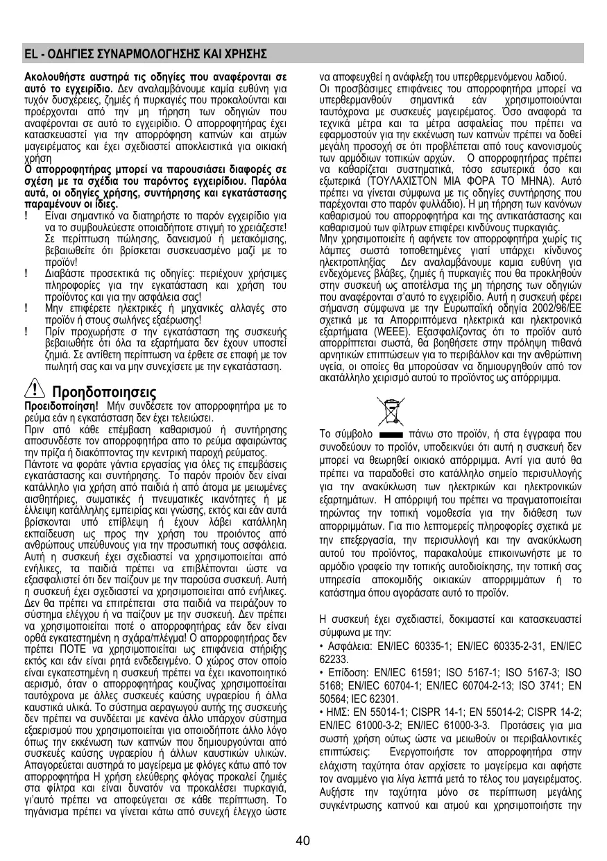 χρησιμοποιούνται ταυτόχρονα με συσκευές μαγειρέματος. Όσο αναφορά τα τεχνικά μέτρα και τα μέτρα ασφαλείας που πρέπει να εφαρμοστούν για την εκκένωση των καπνών πρέπει να δοθεί μεγάλη προσοχή σε ότι προβλέπεται από τους κανονισμούς των αρμόδιων τοπικών αρχών. Ο απορροφητήρας πρέπει να καθαρίζεται συστηματικά, τόσο εσωτερικά όσο και εξωτερικά (ΤΟΥΛΑΧΙΣΤΟΝ ΜΙΑ ΦΟΡΑ ΤΟ ΜΗΝΑ). Αυτό πρέπει να γίνεται σύμφωνα με τις οδηγίες συντήρησης που παρέχονται στο παρόν φυλλάδιο). Η μη τήρηση των κανόνων καθαρισμού του απορροφητήρα και της αντικατάστασης και καθαρισμού των φίλτρων επιφέρει κινδύνους πυρκαγιάς. Μην χρησιμοποιείτε ή αφήνετε τον απορροφητήρα χωρίς τις λάμπες σωστά τοποθετημένες γιατί υπάρχει κίνδυνος ηλεκτροπληξίας Δεν αναλαμβάνουμε καμια ευθύνη για ενδεχόμενες βλάβες, ζημιές ή πυρκαγιές που θα προκληθούν στην συσκευή ως αποτέλσμα της μη τήρησης των οδηγιών που αναφέρονται σ’αυτό το εγχειρίδιο. Αυτή η συσκευή φέρει σήμανση σύμφωνα με την Ευρωπαϊκή οδηγία 2002/96/ΕΕ σχετικά με τα Απορριπτόμενα ηλεκτρικά και ηλεκτρονικά εξαρτήματα (WEEE). Εξασφαλίζοντας ότι το προϊόν αυτό απορρίπτεται σωστά, θα βοηθήσετε στην πρόληψη πιθανά αρνητικών επιπτώσεων για το περιβάλλον και την ανθρώπινη υγεία, οι οποίες θα μπορούσαν να δημιουργηθούν από τον ακατάλληλο χειρισμό αυτού το προϊόντος ως απόρριμμα. Ακολουθήστε αυστηρά τις οδηγίες που αναφέρονται σε αυτό το εγχειρίδιο. Δεν αναλαμβάνουμε καμία ευθύνη για τυχόν δυσχέρειες, ζημιές ή πυρκαγιές που προκαλούνται και προέρχονται από την μη τήρηση των οδηγιών που αναφέρονται σε αυτό το εγχειρίδιο. Ο απορροφητήρας έχει κατασκευαστεί για την απορρόφηση καπνών και ατμών μαγειρέματος και έχει σχεδιαστεί αποκλειστικά για οικιακή Ο απορροφητήρας μπορεί να παρουσιάσει διαφορές σε σχέση με τα σχέδια του παρόντος εγχειρίδιου. Παρόλα αυτά, οι οδηγίες χρήσης, συντήρησης και εγκατάστασης παραμένουν οι ίδιες. Είναι σημαντικό να διατηρήστε το παρόν εγχειρίδιο για να το συμβουλεύεστε οποιαδήποτε στιγμή το χρειάζεστε! Σε περίπτωση πώλησης, δανεισμού ή μετακόμισης, βεβαιωθείτε ότι βρίσκεται συσκευασμένο μαζί με το