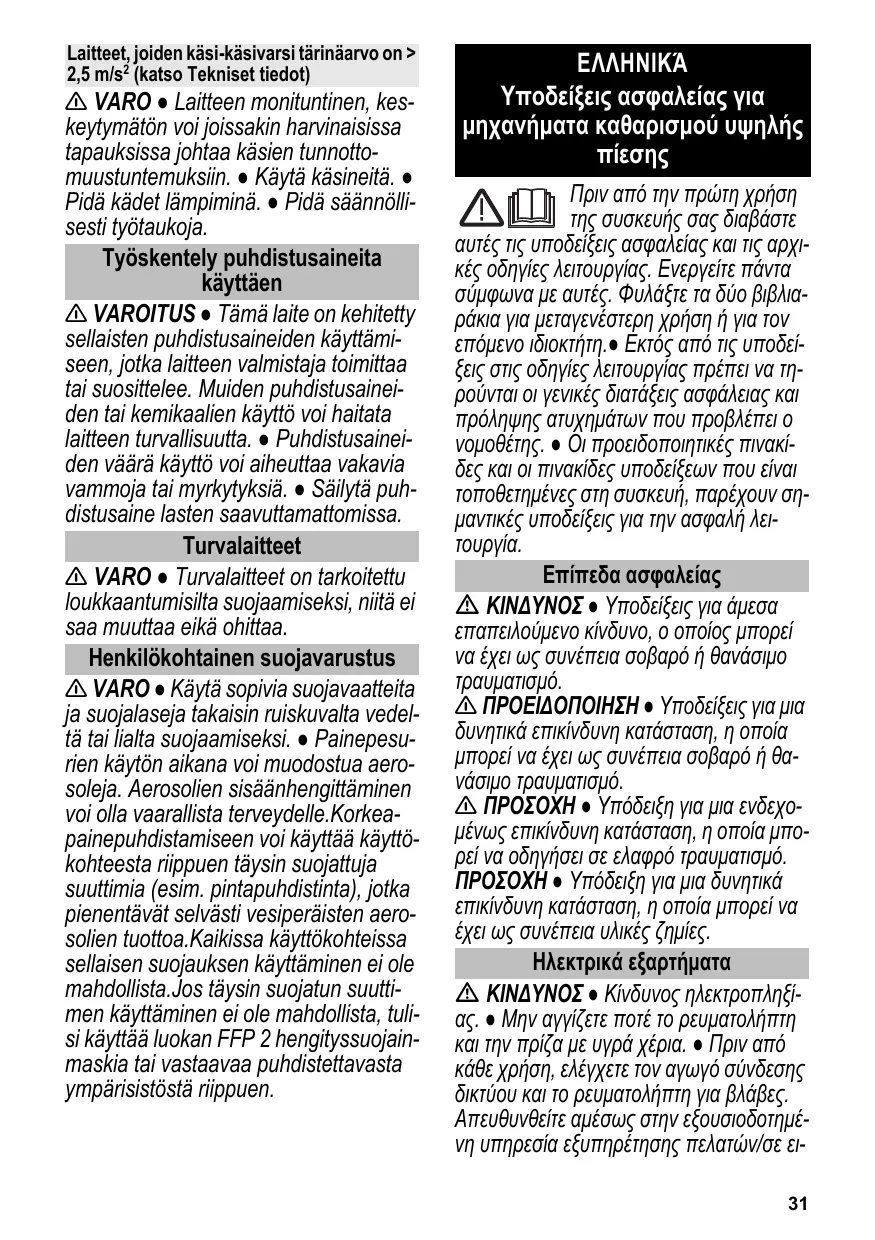 Prima di utilizzare l'apparecchio per la prima volta, leggere queste avvertenze di sicurezza e le istruzioni per l'uso originali, agire corrispondentemente e conservare entrambi i libretti per un uso futuro o per un successivo proprietario.● Osservare sempre sia le indicazioni riportate nelle istruzioni, sia le norme vigenti in materia di sicurezza/antinfortunistica. ● Le targhette di avvertimento poste sull'apparecchio forniscono importanti indicazioni in materia di sicurezza. Niveles de peligro PELIGRO ● Aviso sobre un riesgo de peligro inmediato que puede provocar lesiones corporales graves o la muerte. ADVERTENCIA ● Aviso sobre una situación propablemente peligrosa que puede provocar lesiones corporales graves o la muerte. PRECAUCIÓN ● Indicación sobre una situación que puede ser peligrosa, que puede acarrear lesiones leves. CUIDADO ● Aviso sobre una situación probablemente peligrosa que puede provocar daños materiales. Componentes eléctricos PELIGRO ● Riesgo de descarga eléctrica. ● No tocar nunca la clavija ni el enchufe con manos húmedas. ● Comprobar si está dañado el cable de alimentación con el conector de red antes de cada servicio. Si el cable de alimentación está dañado solicitar al servicio de postventa/electricista autorizado que lo cambie inmediatamente. No operar el equipo con un cable de alimentación da- FFP 2 ou similar, que se adapte às condições de limpeza.
