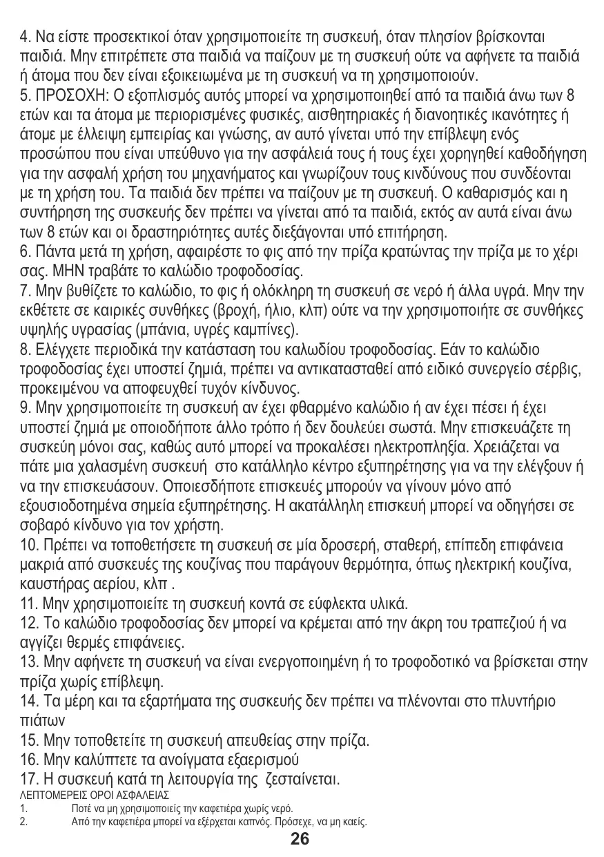 - Mny aφήνετη Σιοκεύν α είαι ενεργοποιμένη ἡ Φροφόδοτικόν α βρίσκεται στην πρίζα χωρίς επίβλεψη.