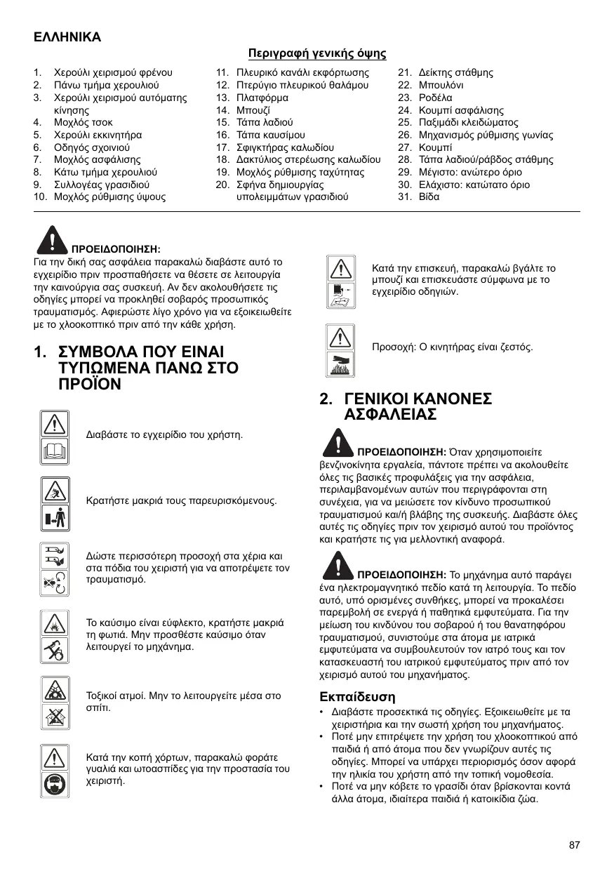 • Ne faites pas tourner le moteur dans un lieu confiné, en raison de la possibilité de dangereuses émanations de monoxyde de carbone. • Tondez uniquement à la lumière du jour ou dans une lumière artificielle de bonne qualité. • Évitez de tondre de l’herbe mouillée, si possible. • Assurez vos pas dans les pentes. • Marchez, ne courez jamais. • Pour les machines rotatives à roues, tondez les pentes dans le sens transversal, jamais en montant ou en descendant. • Soyez particulièrement prudent lors des changements de direction sur les terrains en pente. • Ne coupez pas l’herbe sur des pentes excessivement raides. • Faites particulièrement attention lorsque la tondeuse doit être tirée vers vous. • Arrêtez la/les lame(s) si la tondeuse thermique doit être inclinée pour le transport, lorsque vous traversez des zones sans herbe et lors des déplacements entre les surfaces à tondre. • N’utilisez jamais la tondeuse si ses protecteurs sont endommagés, ou en l’absence de dispositifs de sécurité, comme le déflecteur ou le sac de ramassage. • Ne changez pas les réglages du gouverneur du moteur et ne forcez pas le moteur. • Désengagez les lames et les vitesses avant de démarrer le moteur.