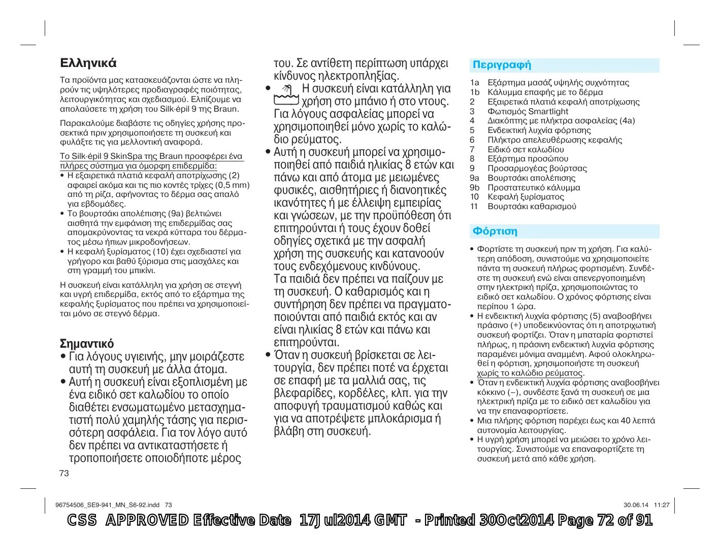 CSS APPROVED Effective Date 17Jul2014 GMT - Printed 30Oct2014 Page 74 of 91 C Καθαρισμός της βούρτσας απολέπισης Μετά τη χρήση, να ξεπλένετε το βουρτσάκι απολέπισης κάτω από τρεχούμενο νερό. Αν χρειάζεται, μπορείτε να χρησιμοποιήσετε υγρό σαπούνι για να το καθαρίσετε καλά. Ανακινήστε το βουρτσάκι για να απομακρυνθούν τα υπολείμματα νερού και αφήστε το να στεγνώσει. Τοποθετήστε το προστατευτικό κάλυμμα (9b) πριν αποθηκεύσετε το βουρτσάκι. E Τα ξυριστικά μέρη της συσκευής πρέπει να λιπαίνονται τακτικά κάθε 3 μήνες. D Αντικατάσταση της βούρτσας απολέπισης Με εβδομαδιαία χρήση, προτείνεται η αντικατάσταση της μονάδας της βούρτσας (9a) μετά από 12 μήνες. Ανταλλακτικές βούρτσες (κωδ. 79 Spa) διατίθενται από τον έμπορο λιανικής πώλησης ή από τα Εξουσιοδοτημένα Κέντρα Service της Braun ή από την ιστοσελίδα www. service.braun.com.
