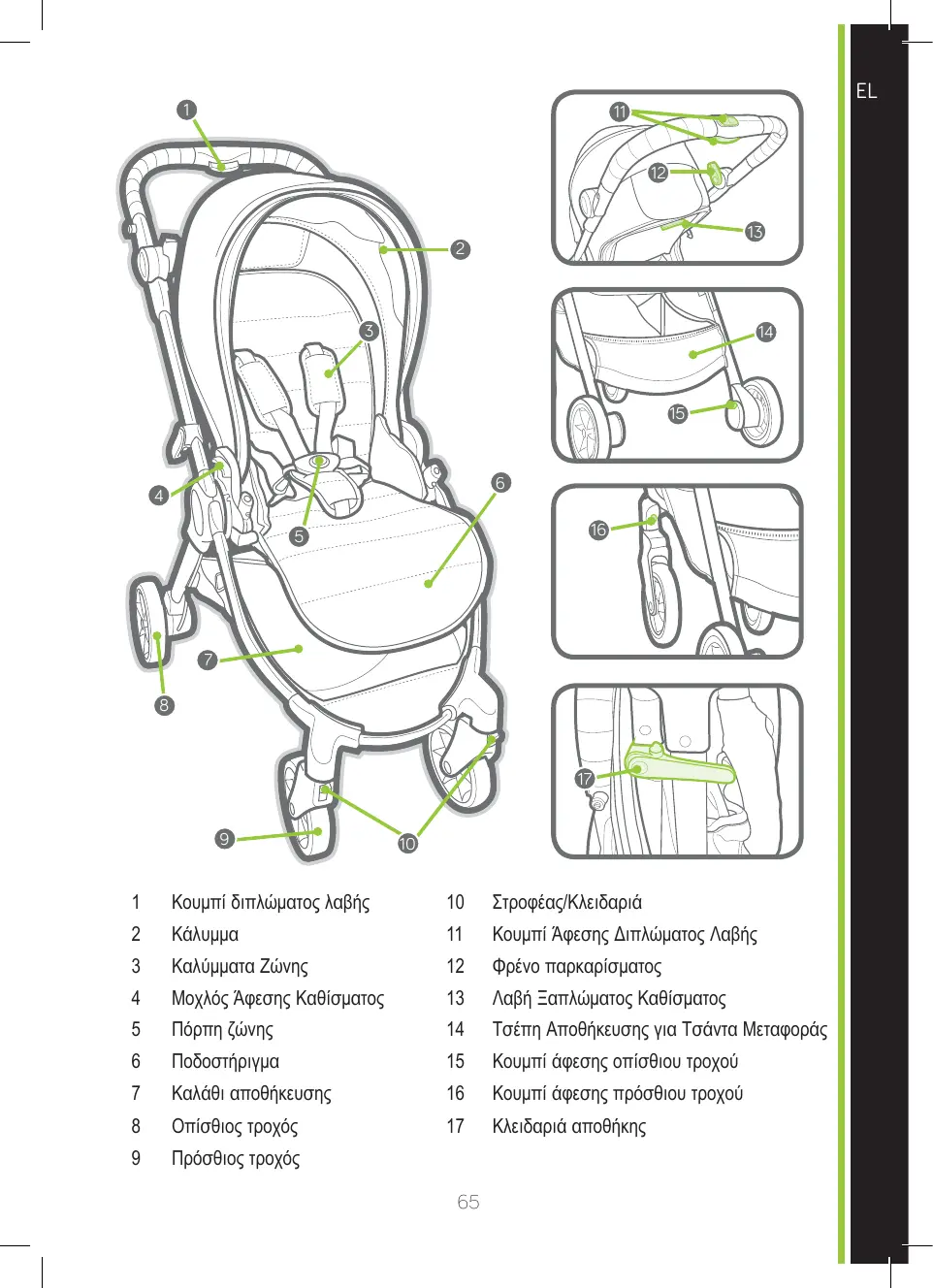 ΠΡΟΕΙΔΟΠΟΙΗΣΗ: Όταν κάνετε ρυθμίσεις στο κάθισμα του καροτσιού, βεβαιωθείτε ότι το κεφάλι, τα χέρια και τα πόδια του παιδιού σας δεν μπλέκονται στα εξαρτήματα του καθίσματος που κινούνται και στο πλαίσιο του καροτσιού. ΞΑΠΛΩΣΤΕ ΤΟ ΠΟΔΟΣΤΗΡΙΓΜΑ 29 Τραβήξτε τους μοχλούς άφεσης κάτω από το ποδοστήριγμα για να ξαπλωθεί το ποδοστήριγμα. ΔΙΠΛΩΜΑ • Βγάλτε το παιδί σας από το κάθισμα. • Βγάλτε όλα τα προσαρτήματα και όλα τα αντικείμενα από το καλάθι. • Αποδεσμεύστε τις κλειδαριές των μπροστινών τροχών. • Αφαιρέστε όλα τα συνδεόμενα εξαρτήματα και όλα τα αντικείμενα από το καλάθι. 30 Σηκώστε το μοχλό άφεσης στο πίσω μέρος του καθίσματος και διπλώστε την πλάτη του καθίσματος προς τα εμπρός. • Το κάθισμα μπορεί να διπλωθεί επίσης προς τα πίσω. ΣΗΜΑΝΤΙΚΟ: Το κάθισμα ΠΡΕΠΕΙ να διπλωθεί προτού διπλώσετε το πλαίσιο του καροτσιού. 31 Γλιστρήστε το κουμπί της λαβής άφεσης διπλώματος ενώ ζουλάτε το κουμπί διπλώματος στη λαβή και διπλώστε τη λαβή προς τα εμπρός. 32 Διπλώστε το άνω πλαίσιο του καροτσιού κάτω στο χαμηλό πλαίσιο του καροτσιού. 33 Σηκώστε το καρότσι από τη λωρίδα μεταφοράς για να βοηθηθείτε στο δίπλωμα των μπροστινών και πίσω πλαισίων του καροτσιού μαζί. 34 Σιγουρευτείτε ότι το λεβιέ ασφάλισης αποθήκευσης έχει μπει στη θέση του. ΛΩΡΊΔΕΣ ΜΕΤΑΦΟΡΆΣ 35 Υπάρχουν δύο λωρίδες μεταφοράς για το καρότσι: Χρησιμοποιήστε την πιο κοντή λωρίδα μεταφοράς, ή την πιο μακριά λωρίδα μεταφοράς στο επάνω μέρος του διπλωμένου καροτσιού για να μεταφέρετε το καρότσι εύκολα.