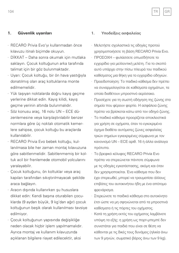 PRIVIA EVO ECE - Grup 0+ · 13 kg ECE - Ομάδα 0+ · 13 χλγρ. Sadece 16 nolu ECE normu veya diğer kıyaslanabilir normları karşılayan üç noktadan bağlantılı emniyet kemerleri ile donatılmış araçlarda kullanılmaya uygundur. Bu koltuk, 36 kg ağırlığa kadar olan en fazla 18 aylık çocuklara uygun 0+ ağırlık sınıfında olan bir koltuktur. Basım hataları, yanlışlıklar ve teknik değişik hakları saklı tutulur. DİKKAT - Daha sonra okunmak üzere mutlaka saklayın. Çocuk koltuğunun arkasında bunun için bir bölme bulunmaktadır. Ενδείκνυται μόνο για χρήση σε οχήματα, τα οποία είναι εξοπλισμένα με εγκεκριμένες ζώνες ασφαλείας 3 σημείων σύμφωνα με τον Κανονισμό ECE Αρ. 16 ή σύμφωνα με άλλα αντίστοιχα πρότυπα. Το παρόν είναι κάθισμα της κατηγορίας βάρους 0+ για παιδιά ηλικίας έως 18 μηνών με ένα σωματικό βάρος έως 13 κιλά. Με την επιφύλαξη σφαλμάτων εκτύπωσης, άλλων σφαλμάτων και τεχνικών τροποποιήσεων. ΠΡΟΣΟΧΗ - Φυλάτε οπωσδήποτε για μια μετέπειτα συμβούλευση. Για αυτό υπάρχει στην όπισθεν πλευρά του παιδικού καθίσματος μια θήκη για τις οδηγίες.