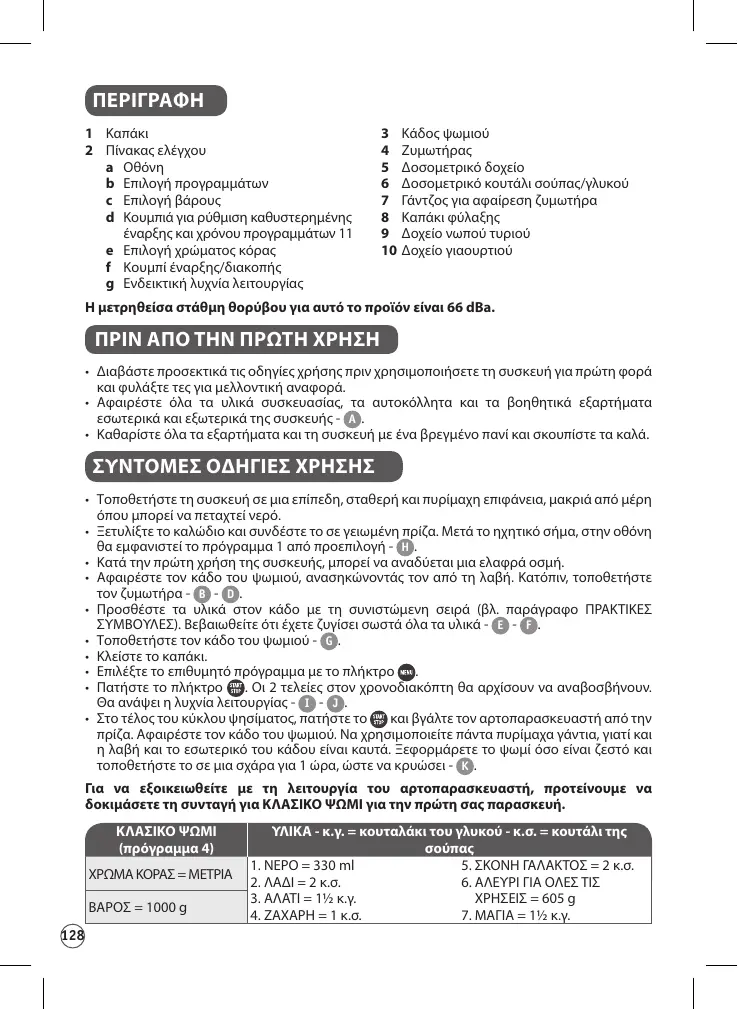 1. Tous les ingrédients utilisés doivent être à température ambiante (sauf indication contraire), et doivent être pesés avec précision. Mesurez les liquides avec le gobelet gradué fourni. Utilisez la cuillère fournie pour mesurer d’un côté les cuillères à café et de l’autre les cuillères à soupe. Des mesures incorrectes se traduiront par de mauvais résultats. La préparation du pain est très sensible aux conditions de température et d’humidité. En cas de forte chaleur, il est conseillé d’utiliser des liquides plus frais qu’à l’accoutumée. De même, en cas de températures basses, il est possible qu’il soit nécessaire de faire tiédir l’eau ou le lait (sans jamais dépasser 35°C).