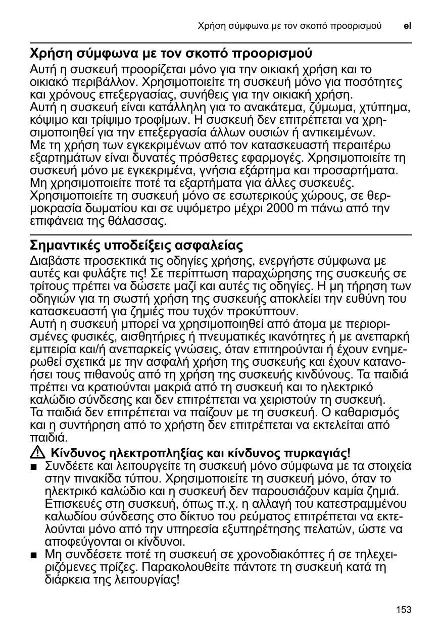 Χρήση σύμφωνα με τον σκοπό προορισμού Αυτή η συσκευή προορίζεται μόνο για την οικιακή χρήση και το οικιακό περιβάλλον. Χρησιμοποιείτε τη συσκευή μόνο για ποσότητες και χρόνους επεξεργασίας, συνήθεις για την οικιακή χρήση. Αυτή η συσκευή είναι κατάλληλη για το ανακάτεμα, ζύμωμα, χτύπημα, κόψιμο και τρίψιμο τροφίμων. Η συσκευή δεν επιτρέπεται να χρησιμοποιηθεί για την επεξεργασία άλλων ουσιών ή αντικειμένων. Με τη χρήση των εγκεκριμένων από τον κατασκευαστή περαιτέρω εξαρτημάτων είναι δυνατές πρόσθετες εφαρμογές. Χρησιμοποιείτε τη συσκευή μόνο με εγκεκριμένα, γνήσια εξάρτημα και προσαρτήματα. Μη χρησιμοποιείτε ποτέ τα εξαρτήματα για άλλες συσκευές. Χρησιμοποιείτε τη συσκευή μόνο σε εσωτερικούς χώρους, σε θερμοκρασία δωματίου και σε υψόμετρο μέχρι 2000 m πάνω από την επιφάνεια της θάλασσας. Σημαντικές υποδείξεις ασφαλείας Διαβάστε προσεκτικά τις οδηγίες χρήσης, ενεργήστε σύμφωνα με αυτές και φυλάξτε τις! Σε περίπτωση παραχώρησης της συσκευής σε τρίτους πρέπει να δώσετε μαζί και αυτές τις οδηγίες. Η μη τήρηση των οδηγιών για τη σωστή χρήση της συσκευής αποκλείει την ευθύνη του κατασκευαστή για ζημιές που τυχόν προκύπτουν. Αυτή η συσκευή μπορεί να χρησιμοποιηθεί από άτομα με περιορισμένες φυσικές, αισθητήριες ή πνευματικές ικανότητες ή με ανεπαρκή εμπειρία και/ή ανεπαρκείς γνώσεις, όταν επιτηρούνται ή έχουν ενημερωθεί σχετικά με την ασφαλή χρήση της συσκευής και έχουν κατανοήσει τους πιθανούς από τη χρήση της συσκευής κινδύνους. Τα παιδιά πρέπει να κρατιούνται μακριά από τη συσκευή και το ηλεκτρικό καλώδιο σύνδεσης και δεν επιτρέπεται να χειριστούν τη συσκευή. Τα παιδιά δεν επιτρέπεται να παίζουν με τη συσκευή. Ο καθαρισμός και η συντήρηση από το χρήστη δεν επιτρέπεται να εκτελείται από W Κίνδυνος ηλεκτροπληξίας και κίνδυνος πυρκαγιάς! ■ Συνδέετε και λειτουργείτε τη συσκευή μόνο σύμφωνα με τα στοιχεία στην πινακίδα τύπου. Χρησιμοποιείτε τη συσκευή μόνο, όταν το ηλεκτρικό καλώδιο και η συσκευή δεν παρουσιάζουν καμία ζημιά. Επισκευές στη συσκευή, όπως π.χ. η αλλαγή του κατεστραμμένου καλωδίου σύνδεσης στο δίκτυο του ρεύματος επιτρέπεται να εκτελούνται μόνο από την υπηρεσία εξυπηρέτησης πελατών, ώστε να αποφεύγονται οι κίνδυνοι. ■ Μη συνδέσετε ποτέ τη συσκευή σε χρονοδιακόπτες ή σε τηλεχειριζόμενες πρίζες. Παρακολουθείτε πάντοτε τη συσκευή κατά τη διάρκεια της λειτουργίας!