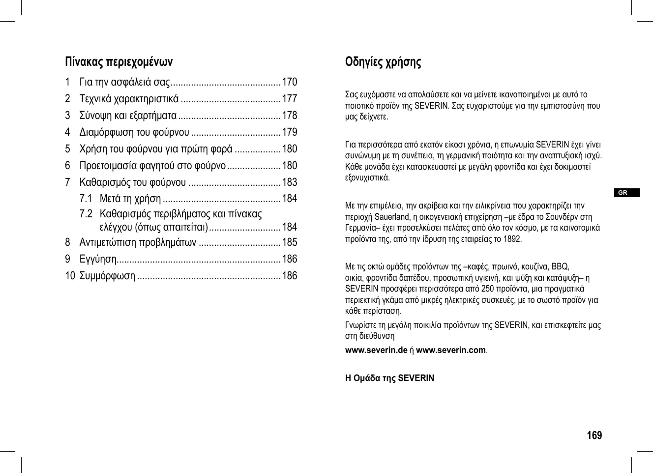 - 10 Συμμόρφωση Οδηγίες χρήσης Σας ευχόμαστε να απολαύσετε και να μείνετε ικανοποιημένοι με αυτό το ποιοτικό προϊόν της SEVERIN. Σας ευχαριστούμε για την εμπιστοσύνη που μας δείχνετε. Για περισσότερα από εκατόν είκοσι χρόνια, η επωνυμία SEVERIN έχει γίνει συνώνυμη με τη συνέπεια, τη γερμανική ποιότητα και την αναπτυξιακή ισχύ. Κάθε μονάδα έχει κατασκευαστεί με μεγάλη φροντίδα και έχει δοκιμαστεί εξονυχιστικά. p. 186