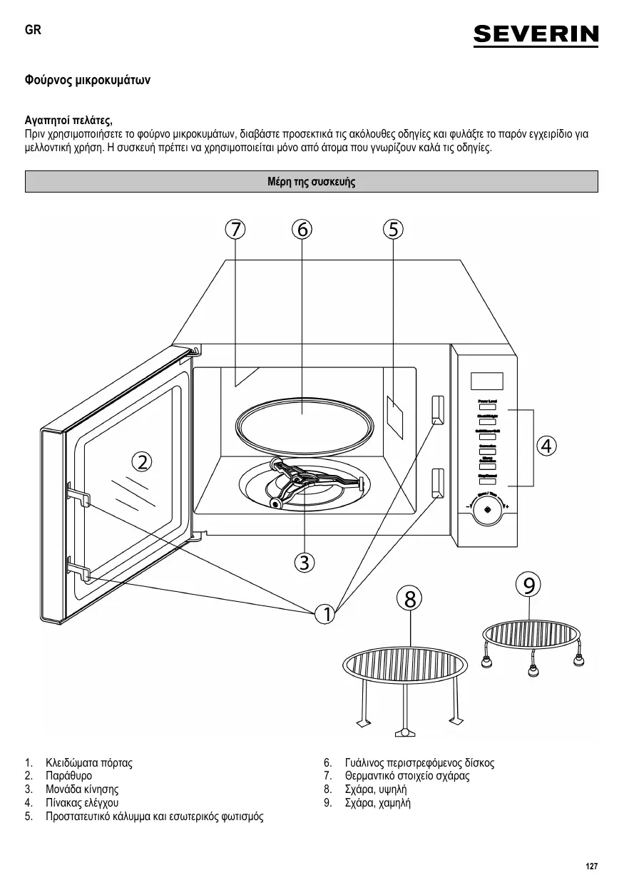 Φούρνος μικροκυμάτων Αγαπητοί πελάτες, Πριν χρησιμοποιήσετε το φούρνο μικροκυμάτων, διαβάστε προσεκτικά τις ακόλουθες οδηγίες και φυλάξτε το παρόν εγχειρίδιο για μελλοντική χρήση. Η συσκευή πρέπει να χρησιμοποιείται μόνο από άτομα που γνωρίζουν καλά τις οδηγίες. Μέρη της συσκευής