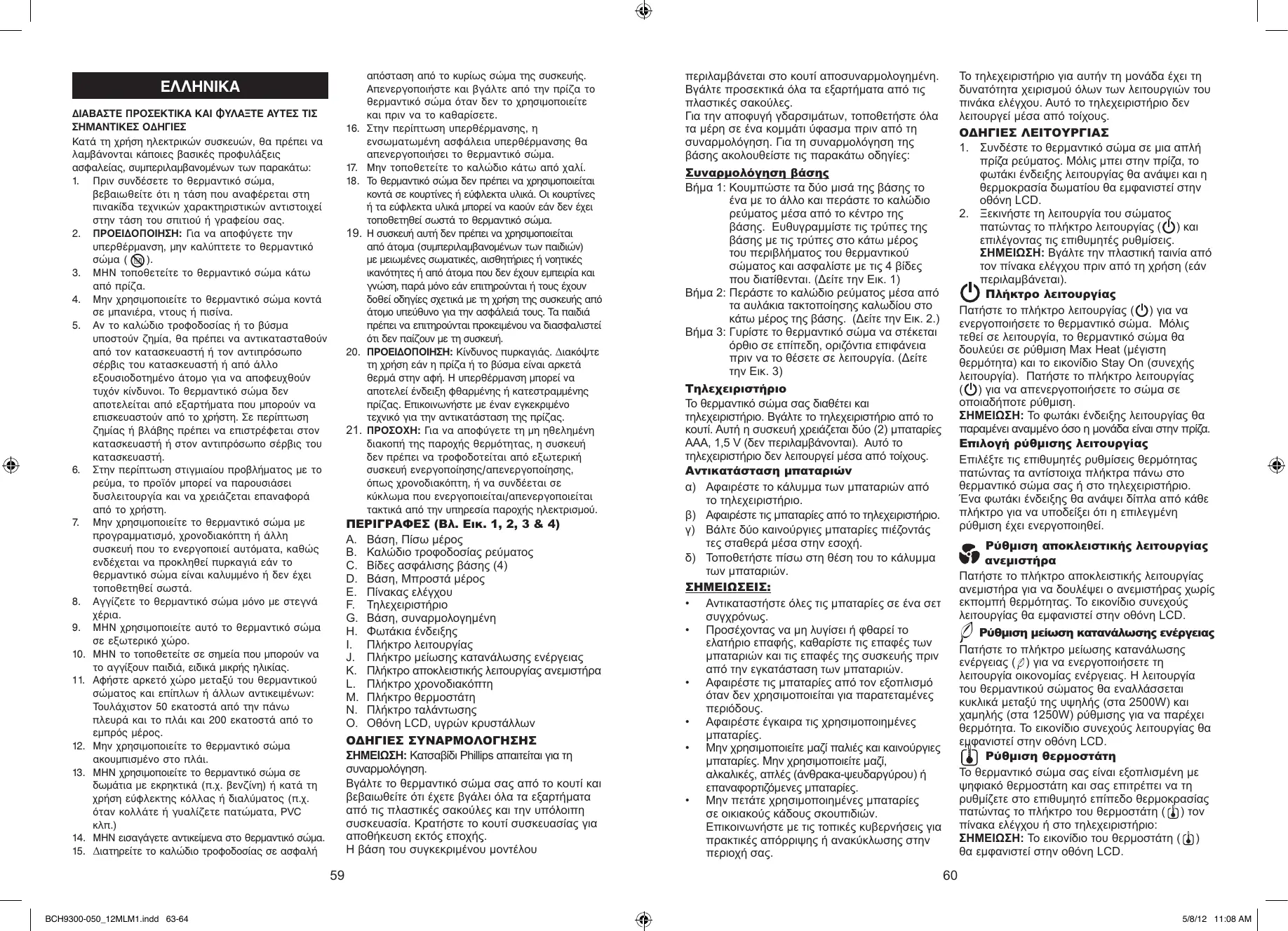 ΕKKΗΝΙΚΑ ΔΙΑΒΑΣΤΕ ΠΡΟΣΕΚΤΙΚΑ ΚΑΙ ΦΥΛΑΞΤΕ ΑΥΤΕΣ ΤΙΣ ΣΗΜΑΝΤΙΚΕΣ ΟΔΗΓΙΕΣ Κατά τη χρήση ηλεκτρικών συσκευών, θα πρέπει να λαμβάνονται κάποιες βασικές προφυλάξεις ασφαλείας, συμπεριλαμβανομένων των παρακάτω: 1. Πριν συνδέσετε το θερμαντικό σώμα, βεβαιωθείτε ότι η τάση που αναφέρεται στη πινακίδα τεχνικών χαρακτηριστικών αντιστοιχεί στην τάση του σπιτιού ή γραφείου σας. 2. ΠΡΟΕΙΔΟΠΟΙΗΣΗ: Για να αποφύγετε την υπερθέρμανση, μην καλύπτετε το θερμαντικό σώμα ( ). 3. ΜΗΝ τοποθετείτε το θερμαντικό σώμα κάτω από πρίζα. 4. Μην χρησιμοποιείτε το θερμαντικό σώμα κοντά σε μπανιέρα, ντους ή πισίνα. 5. Αν το καλώδιο τροφοδοσίας ή το βύσμα υποστούν ζημία, θα πρέπει να αντικατασταθούν από τον κατασκευαστή ή τον αντιπρόσωπο σέρβις του κατασκευαστή ή από άλλο εξουσιοδοτημένο άτομο για να αποφευχθούν τυχόν κίνδυνοι. Το θερμαντικό σώμα δεν αποτελείται από εξαρτήματα που μπορούν να επισκευαστούν από το χρήστη. Σε περίπτωση ζημίας ή βλάβης πρέπει να επιστρέφεται στον κατασκευαστή ή στον αντιπρόσωπο σέρβις του κατασκευαστή. 6. Στην περίπτωση στιγμιαίου προβλήματος με το ρεύμα, το προϊόν μπορεί να παρουσιάσει δυσλειτουργία και να χρειάζεται επαναφορά από το χρήστη. 7. Μην χρησιμοποιείτε το θερμαντικό σώμα με προγραμματισμό, χρονοδιακόπτη ή άλλη συσκευή που το ενεργοποιεί αυτόματα, καθώς ενδέχεται να προκληθεί πυρκαγιά εάν το θερμαντικό σώμα είναι καλυμμένο ή δεν έχει τοποθετηθεί σωστά. 8. Αγγίζετε το θερμαντικό σώμα μόνο με στεγνά χέρια. 9. ΜΗΝ χρησιμοποιείτε αυτό το θερμαντικό σώμα σε εξωτερικό χώρο. 10. ΜΗΝ το τοποθετείτε σε σημεία που μπορούν να το αγγίξουν παιδιά, ειδικά μικρής ηλικίας. 11. Αφήστε αρκετό χώρο μεταξύ του θερμαντικού σώματος και επίπλων ή άλλων αντικειμένων: Τουλάχιστον 50 εκατοστά από την πάνω πλευρά και το πλάι και 200 εκατοστά από το εμπρός μέρος. 12. Μην χρησιμοποιείτε το θερμαντικό σώμα ακουμπισμένο στο πλάι. 13. ΜΗΝ χρησιμοποιείτε το θερμαντικό σώμα σε δωμάτια με εκρηκτικά (π.χ. βενζίνη) ή κατά τη χρήση εύφλεκτης κόλλας ή διαλύματος (π.χ. όταν κολλάτε ή γυαλίζετε πατώματα, PVC κλπ.) 14. ΜΗΝ εισαγάγετε αντικείμενα στο θερμαντικό σώμα. 15. Διατηρείτε το καλώδιο τροφοδοσίας σε ασφαλή