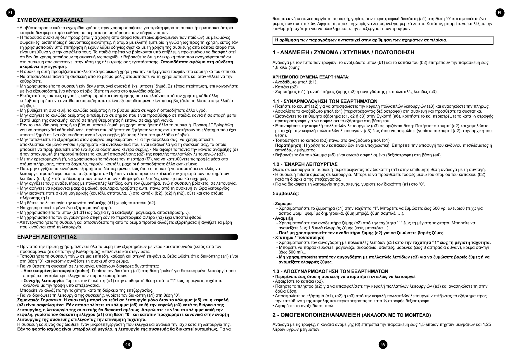 θέσετε εκ νέου σε λειτουργία τη συσκευή, γυρίστε τον περιστροφικό διακόπτη (a1) στη θέση “0” και αφαιρέστε ένα μέρος των συστατικών. Αφήστε τη συσκευή χωρίς να λειτουργεί για μερικά λεπτά. Κατόπιν, μπορείτε να επιλέξετε την επιθυμητή ταχύτητα για να ολοκληρώσετε την επεξεργασία των τροφίμων. Η αρίθμηση των παραγράφων αντιστοιχεί στην αρίθμηση των σχημάτων σε πλαίσια.