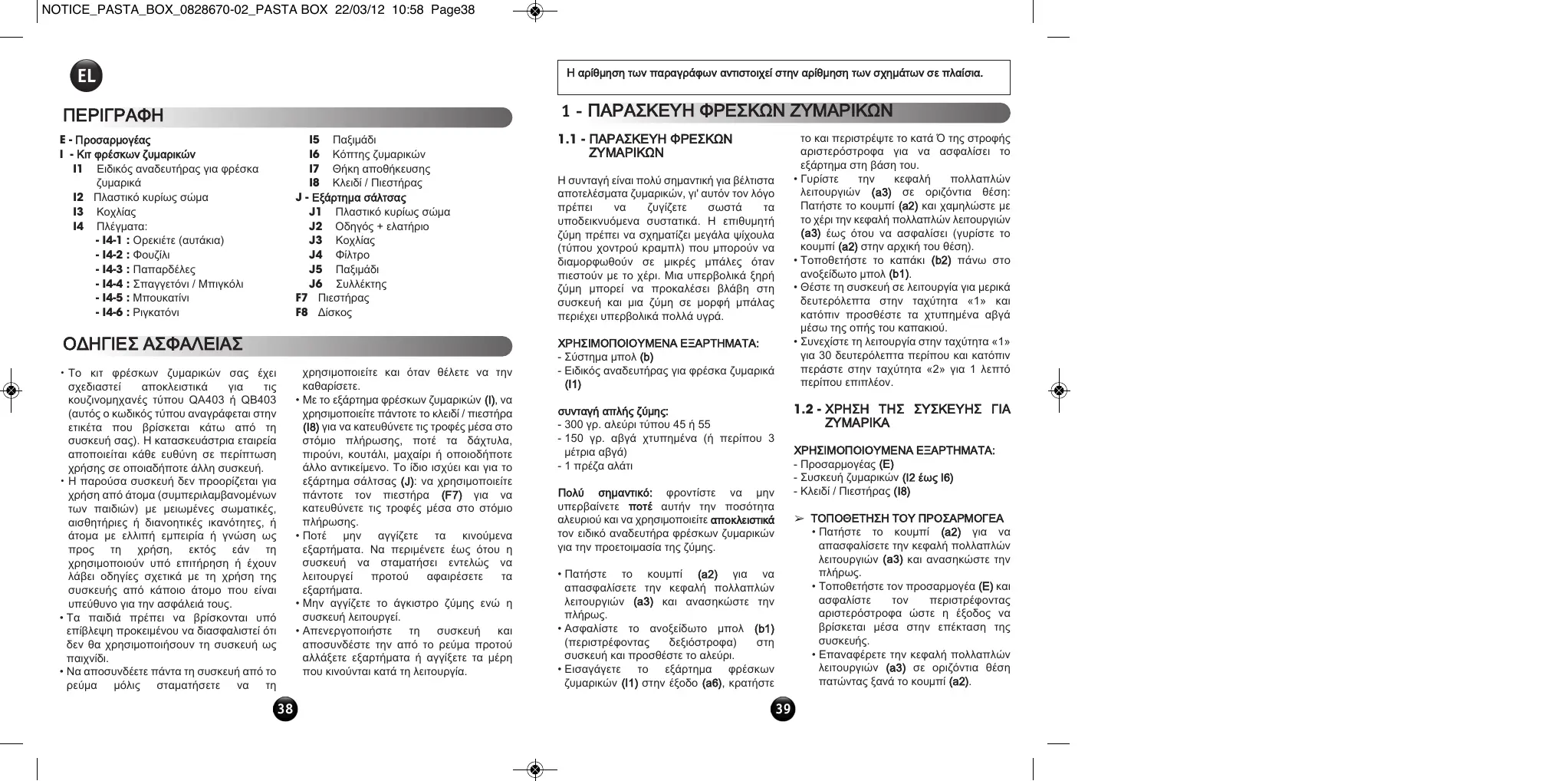 ΟΔΗΓΙΕΣ ΑΣΦΑΛΕΙΑΣ χρησιμοποιείτε και όταν θέλετε να την καθαρίσετε. • Με το εξάρτημα φρέσκων ζυμαρικών (I), να χρησιμοποιείτε πάντοτε το κλειδί / πιεστήρα (I8) για να κατευθύνετε τις τροφές μέσα στο στόμιο πλήρωσης, ποτέ τα δάχτυλα, πιρούνι, κουτάλι, μαχαίρι ή οποιοδήποτε άλλο αντικείμενο. Το ίδιο ισχύει και για το εξάρτημα σάλτσας (J): να χρησιμοποιείτε πάντοτε τον πιεστήρα (F7) για να κατευθύνετε τις τροφές μέσα στο στόμιο πλήρωσης. • Ποτέ μην αγγίζετε τα κινούμενα εξαρτήματα. Να περιμένετε έως ότου η συσκευή να σταματήσει εντελώς να λειτουργεί προτού αφαιρέσετε τα εξαρτήματα. • Μην αγγίζετε το άγκιστρο ζύμης ενώ η συσκευή λειτουργεί. • Απενεργοποιήστε τη συσκευή και αποσυνδέστε την από το ρεύμα προτού αλλάξετε εξαρτήματα ή αγγίξετε τα μέρη που κινούνται κατά τη λειτουργία.