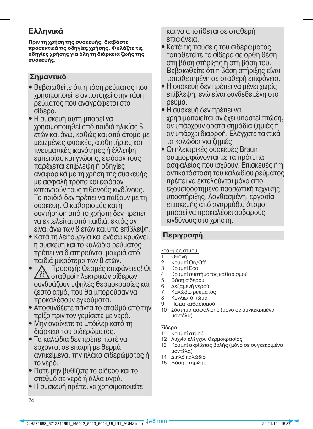 ‹‹Los electrodomésticos Braun cumplen todos los estándares de seguridad aplicables. De la reparación o sustitución del cable de red únicamente debe encargarse personal de servicio técnico autorizado. Un trabajo de reparación inadecuado y no profesional puede resultar en un considerable peligro para el usuario. Descripción Centro de planchado al vapor 1 Pantalla 2 Botón de encendido/apagado 6 Depósito de agua 7 Cable de alimentación 8 Tapón roscado 9 Tapón de limpieza 10 Sistema de bloqueo (solo en algunos modelos) Plancha 11 Botón de vapor 12 Luz de control de temperatura 13 Botón de golpe con precisión (solo en algunos modelos) 14 Cable doble 15 Parte trasera de apoyo