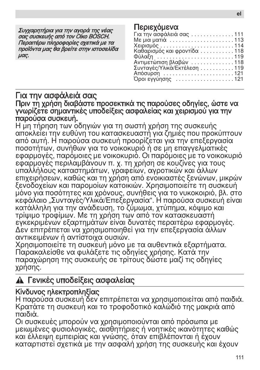 Για την ασφάλειά σας . . . . . . . . . . . . . . 111 Με μια ματιά . . . . . . . . . . . . . . . . . . . . . 113 Χειρισμός . . . . . . . . . . . . . . . . . . . . . . . . 114 Καθαρισμός και φροντίδα . . . . . . . . . . . 118 Φύλαξη . . . . . . . . . . . . . . . . . . . . . . . . . 119 Αντιμετώπιση βλαβών . . . . . . . . . . . . . . 118 Συνταγές/Υλικά/Εκτέλεση . . . . . . . . . . . 119 Απόσυρση . . . . . . . . . . . . . . . . . . . . . . . 121 Όροι εγγύησης . . . . . . . . . . . . . . . . . . . 121