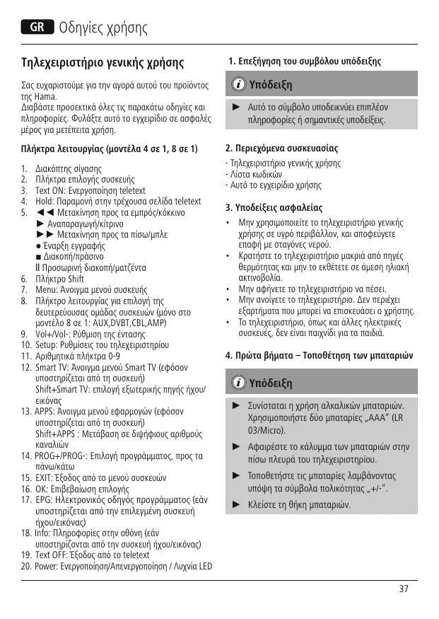 R. Vérifiez que vous avez bien appuyé sur la touche de l‘appareil correspondant au système désiré. R. Remplacez les piles en cas de niveau faible. Q. Plusieurs codes d’appareils sont mentionnés pour la marque de mon appareil ; lequel choisir ? R. Pour déterminer le bon code de votre appareil AV, testez successivement les codes, l’un après l’autre, jusqu’à ce que la plupart des fonctions de votre appareil fonctionnent correctement. Q. Mon appareil AV réagit uniquement à certaines commandes de la télécommande. R. Testez d‘autres codes jusqu’à ce que la plupart des fonctions de votre appareil fonctionnent correctement. 9. Service et assistance En cas de question concernant le produit, veuillez vous adresser au service de conseil produits de Hama. Ligne téléphonique directe : +49 9091 502-115 (allemand/anglais) Vous trouverez ici de plus amples informations concernant l‘assistance : www.hama.com 10. Consignes de recyclage Remarques concernant la protection de l’environnement: Conformément à la directive européenne 2012/19/EU et 2006/66/CE, et afin d‘atteindre un certain nombre d‘objectifs en matière de protection de l‘environnement, les règles suivantes doivent être appliquées: Les appareils électriques et électroniques ainsi que les batteries ne doivent pas être éliminés avec les déchets ménagers. Le pictogramme “picto” présent sur le produit, son manuel d‘utilisation ou son emballage indique que le produit est soumis à cette réglementation. Le consommateur doit retourner le produit/la batterie usager aux points de collecte prévus à cet effet. Il peut aussi le remettre à un revendeur. En permettant enfin le recyclage des produits ainsi que les batteries, le consommateur contribuera à la protection de notre environnement. C‘est un acte écologique.