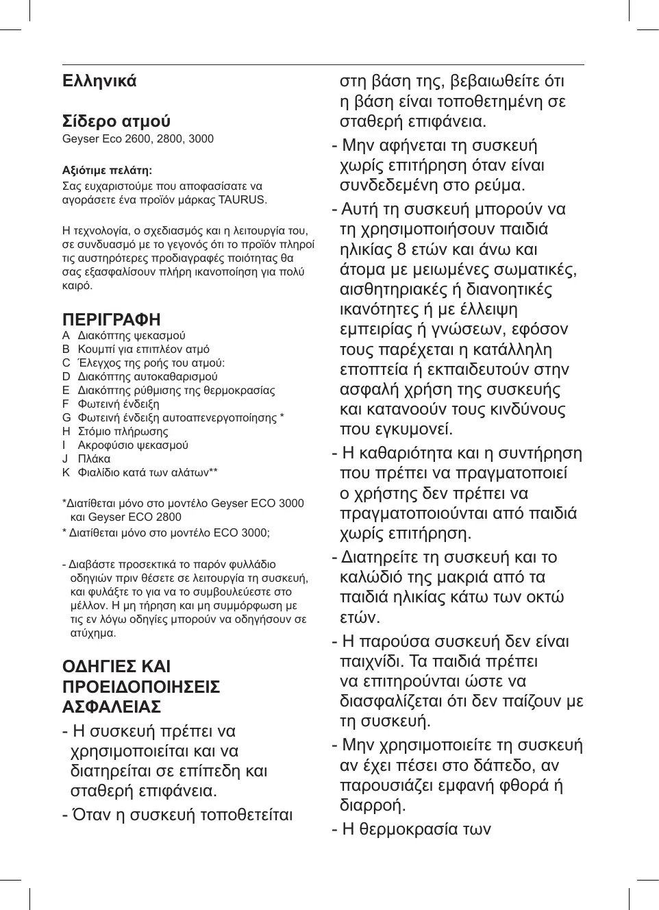 - Passer le fer à repasser de haut en bas en appuyant sur le bouton vapeur ( B ). Important : pour le coton et le lin, nous vous conseillons de mettre en contact la base du fer à repasser avec le tissu. Pour les tissus plus délicats, nous vous conseillons de l’éloigner quelques centimètres. FONCTION D’ARRÊT AUTOMATIQUE (AUTOOFF): * - Afin d’économiser de l’énergie, l’appareil passe en mode de déconnexion automatique (auto-off) s’il reste inutilisé pendant un certain laps de temps. Lorsque cela se produit, un signal sonore sera émis et le voyant lumineux de déconnexion automatique (G) clignotera pour indiquer que cette fonction est activée. - Allumage automatique en position horizontale : après environ 30 secondes sans bouger l’appareil. - Allumage automatique en position verticale : après environ 8 minutes sans bouger l’appareil. - Pour revenir en mode de fonctionnement normal, il suffit simplement de bouger l’appareil. *Disponible uniquement dans le modèle Geyser ECO 3000 et Geyser ECO 2800 APRÈS UTILISATION DE L’APPAREIL : - Choisir la position minimum (MIN) grâce au sélecteur de température. - Débrancher l’appareil de la prise secteur. - Retirer l’eau du réservoir. - Nettoyer l’appareil.