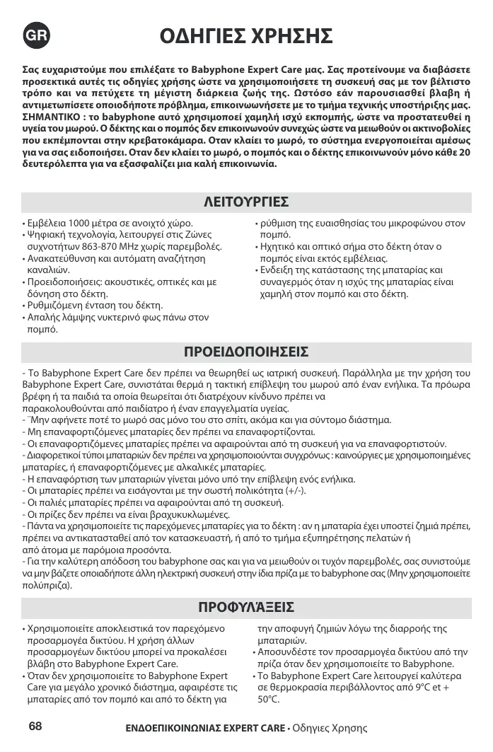 Σας ευχαριστούμε που επιλέξατε τo Babyphone Expert Care μας. Σας προτείνουμε να διαβάσετε προσεκτικά αυτές τις οδηγίες χρήσης ώστε να χρησιμοποιήσετε τη συσκευή σας με τον βέλτιστο τρόπο και να πετύχετε τη μέγιστη διάρκεια ζωής της. Ωστόσο εάν παρουσιασθεί βλαβη ή αντιμετωπίσετε οποιοδήποτε πρόβλημα, επικοινωωνήσετε με το τμήμα τεχνικής υποστήριξης μας. ΣΗΜΑΝΤΙΚΟ : το babyphone αυτό χρησιμοποεί χαμηλή ισχύ εκπομπής, ώστε να προστατευθεί η υγεία του μωρού. Ο δέκτης και ο πομπός δεν επικοινωνούν συνεχώς ώστε να μειωθούν οι ακτινοβολίες που εκπέμπονται στην κρεβατοκάμαρα. Οταν κλαίει το μωρό, το σύστημα ενεργοποιείται αμέσως για να σας ειδοποιήσει. Οταν δεν κλαίει το μωρό, ο πομπός και ο δέκτης επικοινωνούν μόνο κάθε 20 δευτερόλεπτα για να εξασφαλίζει μια καλή επικοινωνία.