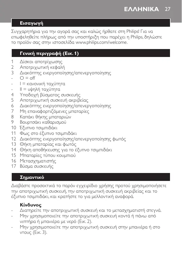 Εάν χρησιμοποιείτε την αποτριχωτική συσκευή στο μπάνιο, μην χρησιμοποιείτε καλώδιο επέκτασης (Εικ. 4). Προειδοποίηση Να διατηρείτε την αποτριχωτική συσκευή ακριβείας και το έξυπνο τσιμπιδάκι στεγνά. Χρησιμοποιείτε την αποτριχωτική συσκευή μόνο με το μετασχηματιστή που παρέχεται. Μην χρησιμοποιείτε την αποτριχωτική συσκευή, την αποτριχωτική συσκευή ακριβείας, το έξυπνο τσιμπιδάκι και το μετασχηματιστή αν έχουν υποστεί βλάβη. Εάν ο μετασχηματιστής υποστεί βλάβη, θα πρέπει να αντικατασταθεί μόνο με αυθεντικό προς αποφυγή κινδύνου. Ελέγξτε εάν η τάση που αναγράφεται στο μετασχηματιστή αντιστοιχεί στην τοπική τάση ρεύματος προτού συνδέσετε την αποτριχωτική συσκευή. Μην αποσπάτε το μετασχηματιστή για να τον αντικαταστήσετε με άλλο βύσμα, καθώς μπορεί να προκληθεί κίνδυνος. Η αποτριχωτική συσκευή, η αποτριχωτική συσκευή ακριβείας και το έξυπνο τσιμπιδάκι δεν προορίζονται για χρήση από άτομα (συμπεριλαμβανομένων των παιδιών) με περιορισμένες σωματικές, αισθητήριες ή διανοητικές ικανότητες ή από άτομα χωρίς εμπειρία και γνώση, εκτός εάν τα χρησιμοποιούν υπό επιτήρηση ή έχουν λάβει οδηγίες σχετικά με τη χρήση των συσκευών από άτομο υπεύθυνο για την ασφάλειά τους. Τα παιδιά θα πρέπει να επιβλέπονται προκειμένου να διασφαλιστεί ότι δεν θα παίζουν με την αποτριχωτική συσκευή, την αποτριχωτική συσκευή ακριβείας και το έξυπνο τσιμπιδάκι. Κρατήστε τις μπαταρίες τύπου κουμπιού που χρησιμοποιείτε στο έξυπνο τσιμπιδάκι μακριά από παιδιά και κατοικίδια. Σε περίπτωση κατάποσης, υπάρχει κίνδυνος πνιγμού. Η αποτριχωτική συσκευή προορίζεται μόνο για την αφαίρεση της γυναικείας τριχοφυΐας από τα πόδια. Η αποτριχωτική συσκευή ακριβείας προορίζεται για την αφαίρεση της γυναικείας τριχοφυΐας στην περιοχή του μπικίνι και στις μασχάλες, καθώς και σε δύσκολες περιοχές, όπως τα γόνατα και οι αστράγαλοι. Μην χρησιμοποιείτε τις συσκευές για κανέναν άλλο σκοπό. Για λόγους υγιεινής, η αποτριχωτική συσκευή, η αποτριχωτική συσκευή ακριβείας και το έξυπνο τσιμπιδάκι θα πρέπει να χρησιμοποιούνται μόνο από ένα άτομο. Ελληνικα 29
