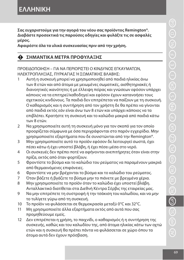 ΠΡΟΕΙΔΟΠΟΙΗΣΗ – ΓΙΑ ΝΑ ΠΕΡΙΟΡΙΣΤΕΙ Ο ΚΙΝΔΥΝΟΣ ΕΓΚΑΥΜΑΤΩΝ, ΗΛΕΚΤΡΟΠΛΗΞΙΑΣ, ΠΥΡΚΑΓΙΑΣ Ή ΣΩΜΑΤΙΚΗΣ ΒΛΑΒΗΣ: Αυτή η συσκευή μπορεί να χρησιμοποιηθεί από παιδιά ηλικίας άνω των 8 ετών και από άτομα με μειωμένες σωματικές, αισθητηριακές ή διανοητικές ικανότητες ή με έλλειψη πείρας και γνώσεων εφόσον υπάρχει κάποιος να τα επιτηρεί/καθοδηγεί και εφόσον έχουν κατανοήσει τους σχετικούς κινδύνους. Τα παιδιά δεν επιτρέπεται να παίζουν με τη συσκευή. Ο καθαρισμός και η συντήρηση από τον χρήστη δε θα πρέπει να γίνονται από παιδιά εκτός εάν είναι άνω των 8 ετών και υπάρχει κάποιος να τα επιβλέπει. Κρατήστε τη συσκευή και το καλώδιο μακριά από παιδιά κάτω των 8 ετών. Να χρησιμοποιείτε αυτή τη συσκευή μόνο για τον σκοπό για τον οποίο προορίζεται σύμφωνα με όσα περιγράφονται στο παρόν εγχειρίδιο. Μην χρησιμοποιείτε εξαρτήματα που δε συνιστώνται από την Remington®. Μην χρησιμοποιείτε αυτό το προϊόν εφόσον δε λειτουργεί σωστά, έχει πέσει κάτω ή έχει υποστεί βλάβη, ή έχει πέσει μέσα στο νερό. Οι συσκευές δεν πρέπει ποτέ να αφήνονται ανεπιτήρητες όταν είναι στην πρίζα, εκτός από όταν φορτίζουν. Φροντίστε το βύσμα και το καλώδιο του ρεύματος να παραμένουν μακριά από θερμαινόμενες επιφάνειες. Φροντίστε να μην βρέχονται το βύσμα και το καλώδιο του ρεύματος. Όταν βάζετε ή βγάζετε το βύσμα μην το πιάνετε με βρεγμένα χέρια. Μην χρησιμοποιείτε το προϊόν όταν το καλώδιο έχει υποστεί βλάβη. Ανταλλακτικό διατίθεται στα Διεθνή Κέντρα Σέρβις της εταιρείας μας. Να μην επιτρέπετε τη συστροφή ή την τσάκιση του καλωδίου, και να μην το τυλίγετε γύρω από τη συσκευή. 10 Το προϊόν να φυλάσσεται σε θερμοκρασία μεταξύ 0°C και 32°C. 11 Μη χρησιμοποιείτε άλλα εξαρτήματα εκτός από αυτά που σας προμηθεύουμε εμείς. 12 Δεν επιτρέπεται η χρήση, το παιχνίδι, ο καθαρισμός ή η συντήρηση της συσκευής, καθώς και του καλωδίου της, από άτομα ηλικίας κάτω των οχτώ ετών και η συσκευή θα πρέπει πάντα να φυλάσσεται σε χώρο όπου τα άτομα αυτά δεν έχουν πρόσβαση.