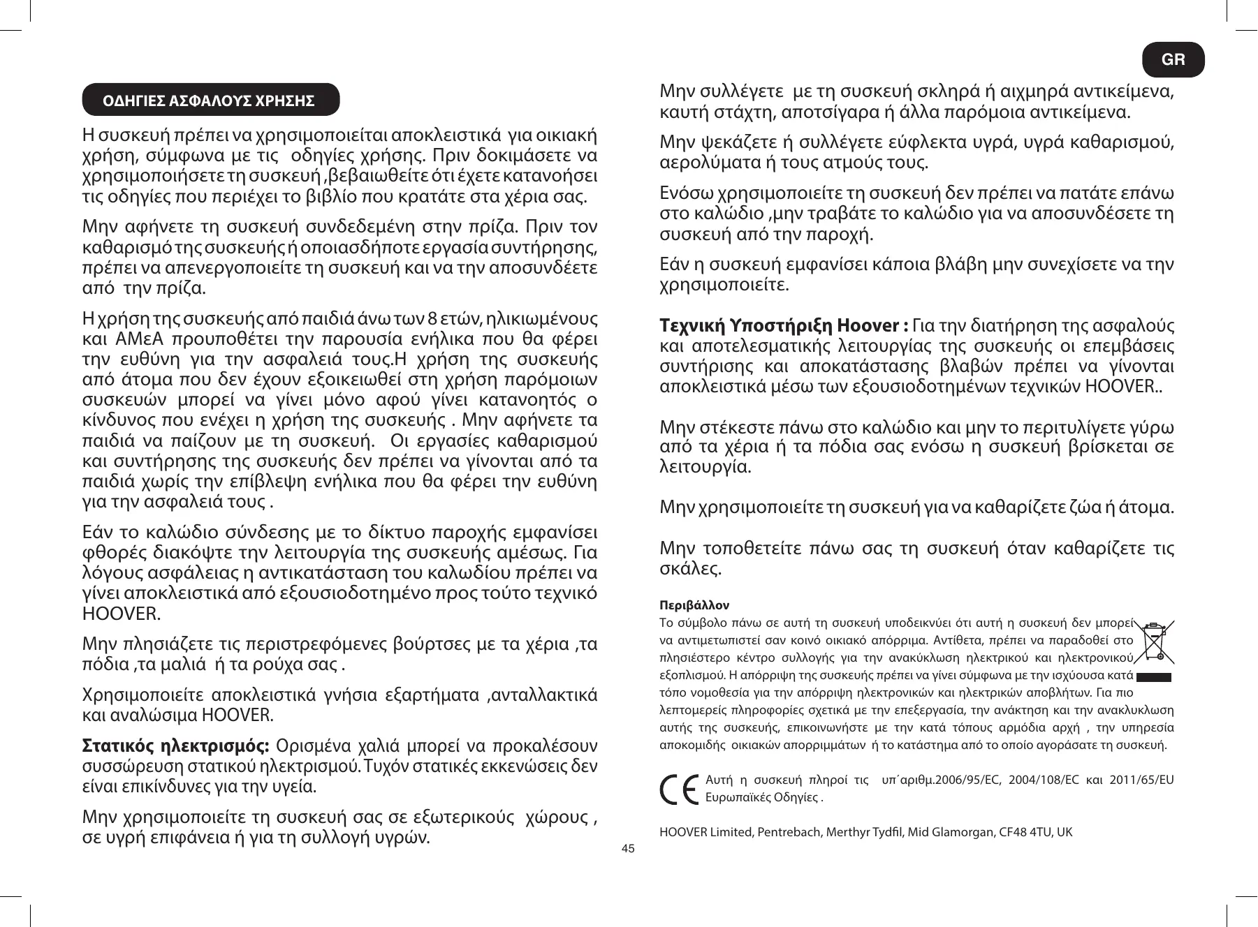 υπ΄αριθμ.2006/95/EC, 2004/108/EC και 2011/65/EU HOOVER Limited, Pentrebach, Merthyr Tydfil, Mid Glamorgan, CF48 4TU, UK 45