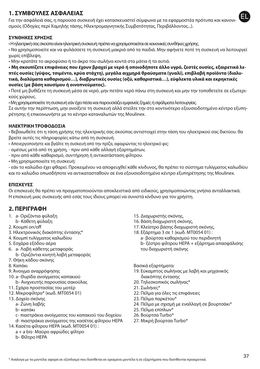 1. a – Parking horizontal b – Parking vertical 19. Flexible avec crosse et variateur mécanique de puissance 20. Tube télescopique* 21. Tubes* • Ne le coincez pas et ne le passez pas sur des arêtes tranchantes. • Si vous utilisez une rallonge électrique, assurez-vous qu’elle est en parfait état et de section adaptée à la puissance de votre aspirateur. • Votre aspirateur est équipé d'une protection qui évite la surchauffe du moteur. Dans certains cas (utilisation de la crosse sur fauteuil, sièges…) la protection se déclenche et l'appareil peut émettre un bruit inhabituel et sans gravité. • Ne déplacez pas l’aspirateur en tirant sur le cordon, l’appareil doit être déplacé par sa poignée de transport. • N’utilisez pas le cordon pour soulever l’appareil. • Ne débranchez jamais l’appareil en tirant sur le cordon. • Ne faites jamais fonctionner l’aspirateur sans boîte à poussière (13) ni sans cassette filtre HEPA (14) : filtre mousse noir (14a) et fitre HEPA (14b). • N’utilisez que des filtres d’origine Moulinex. • N’utilisez que des accessoires d’origine Moulinex. • En cas de difficultés pour obtenir les accessoires et les filtres pour cet aspirateur, contactez le service consommateurs Moulinex. • Arrêtez et débranchez votre aspirateur après chaque utilisation. • Arrêtez et débranchez toujours votre aspirateur avant l’entretien ou le nettoyage. • Cet appareil n’est pas prévu pour être utilisé par des personnes (y compris les enfants) dont les capacités physiques, sensorielles ou mentales sont réduites, ou des personnes dénuées d’expérience ou de connaissance, sauf si elles ont pu bénéficier, par l’intermédiaire d’une personne responsable de leur sécurité, d’une surveillance ou d’instructions préalables concernant l’utilisation de l’appareil. Il convient de surveiller les enfants pour s’assurer qu’ils ne jouent pas avec l’appareil.