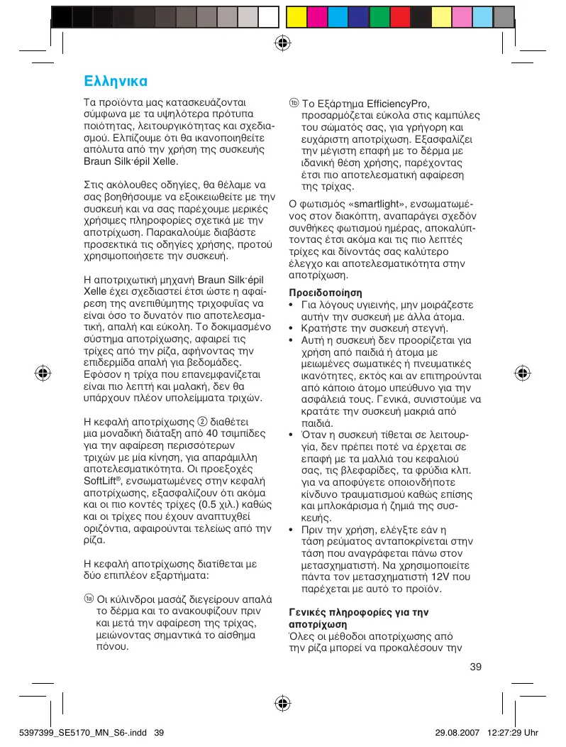 ανάπτυξη τριχών κάτω από το δέρμα και ερεθισμό (π.χ. φαγούρα, ενόχληση και κοκκίνισμα του δέρματος) ανάλογα με την κατάσταση του δέρματος και της Αυτή είναι μια φυσιολογική αντίδραση που εξαφανίζεται γρήγορα, αλλά μπορεί να παρουσιάζεται πιο έντονα όταν αφαιρείτε τρίχες από την ρίζα τις πρώτες φορές της αποτρίχωσης ή εάν έχετε ευαίσθητο δέρμα. Εάν μετά από 36 ώρες, το δέρμα εξακολουθεί να είναι ερεθισμένο, σας συνιστούμε να επικοινωνήσετε με τον γιατρό σας. Γενικά, η αντίδραση του δέρματος και το αίσθημα πόνου τείνουν να μειώνονται σημαντικά με την επαναλαμβανόμενη χρήση του Silk·épil. Σε ορισμένες περιπτώσεις μπορεί να δημιουργηθεί φλεγμονή στο δέρμα εξαιτίας της εισόδου βακτηριδίων μέσα στο δέρμα (π.χ. όταν σύρετε την συσκευή πάνω στο δέρμα). Ο σχολαστικός καθαρισμός της κεφαλής αποτρίχωσης πριν από κάθε χρήση ελαχιστοποιεί τον κίνδυνο μόλυνσης. Εάν έχετε οποιεσδήποτε αμφιβολίες σχετικά με την χρήση αυτής της συσκευής, παρακαλούμε συμβουλευτείτε τον γιατρό σας. Στις ακόλουθες περιπτώσεις, αυτή η συσκευή θα πρέπει να χρησιμοποιηθεί μόνο αφού έχετε πρώτα συμβουλευτεί έναν γιατρό: – έκζεμα, πληγές, φλεγμονές ερεθισμένου δέρματος όπως θυλακίτιδα (πυώδη θυλάκια τριχών) και κιρσοφλεβίτιδα – γύρω από κρεατοελιές – μειωμένη ανοσία του δέρματος π.χ. σακχαρώδης διαβήτης, κατά τη διάρκεια της εγκυμοσύνης, νόσος Raynaud’s – αιμοφιλία, κάντιντα ή ανοσοποιητική ανεπάρκεια. Μερικές χρήσιμες συμβουλές Η αποτρίχωση είναι ευκολότερη και πιο άνετη όταν οι τρίχες έχουν το ιδανικό μήκος των 2-5 χιλ. (0.08 – 0.2 ίντσες). Εάν οι τρίχες είναι μακρύτερες, συνιστούμε να ξυρίζεστε πρώτα και να αποτριχώνετε τις πιο κοντές τρίχες που ξαναβγαίνουν μετά από 1 ή 2 εβδομάδες. Όταν κάνετε αποτρίχωση για πρώτη φορά, συνιστάται να την κάνετε το απόγευμα, έτσι ώστε οποιοδήποτε πιθανό κοκκίνισμα να εξαφανιστεί κατά τη διάρκεια της νύχτας. Για να ανακουφίσετε το δέρμα, συνιστούμε να απλώνετε μια ενυδατική κρέμα μετά την αποτρίχωση. Οι λεπτές τρίχες που αναπτύσσονται ξανά, μπορεί να μην βγουν έως την επιφάνεια του δέρματος. Η τακτική χρήση των σφουγγαριών μασάζ (π.χ. μετά το ντους) ή τα πήλινγκ απολέπισης βοηθούν στην αποφυγή της ανάπτυξης των τριχών στο εσωτερικό του δέρματος καθώς το απαλό τρίψιμο απομακρύνει το πάνω στρώμα του δέρματος και οι λεπτές τρίχες μπορούν να βγουν στην επιφάνεια του δέρματος. Περιγραφή (δείτε σελίδα 4)