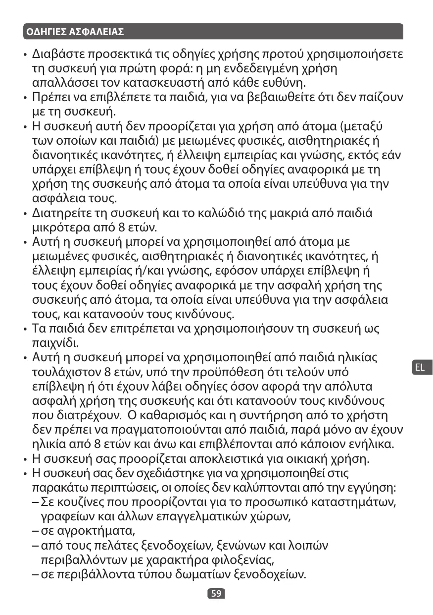 • Ne mettez pas l’appareil, le socle, le câble d’alimentation ou la fiche dans l’eau ou tout autre liquide. • N’utilisez pas la bouilloire si le câble d’alimentation ou la fiche sont endommagés. Faites les obligatoirement remplacer par le fabricant, son service après-vente ou des personnes de qualification similaire afin d’éviter tout danger. • Il convient de surveiller les enfants pour s’assurer qu’ils ne jouent pas avec l’appareil. • Le nettoyage et l’entretien par l’usager ne doivent pas être effectués par des enfants sans surveillance. • AVERTISSEMENT: Soyez prudent lors de la manipulation de votre appareil (nettoyage, remplissage et versage) : éviter tout débordement de liquide sur les connecteurs. • Toujours suivre les instructions de nettoyage pour nettoyer votre appareil; ––Débrancher l’appareil. ––Ne pas nettoyer l’appareil chaud. ––Nettoyer avec un chiffon ou une éponge humide. ––Ne jamais mettre l’appareil dans l’eau ou sous l’eau courante. • AVERTISSEMENT : Risques de blessures en cas de mauvaise utilisation de l’appareil. • N’utilisez votre bouilloire que pour faire chauffer de l’eau potable. • AVERTISSEMENT : La surface de l’élément chauffant présente une chaleur résiduelle après utilisation. • Assurez vous de ne toucher que la poignée de la bouilloire pendant la chauffe et jusqu’au refroidissement complet. • Votre appareil est destiné uniquement à un usage domestique et à l’intérieur de la maison et à une altitude inférieure à 4000 m. • Pour votre sécurité, cet appareil est conforme aux normes et réglementations applicables (Directives Basse Tension, Compatibilité Electromagnétique, Matériaux en contact des aliments, Environnement,...). • Branchez l’appareil uniquement sur une prise secteur reliée à la terre. Vérifiez que la tension d’alimentation indiquée sur la plaque signalétique de l’appareil correspond bien à celle de votre installation. • Toute erreur de branchement annule la garantie. 2