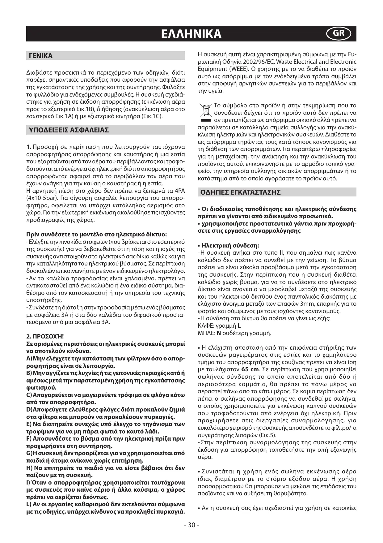EΛΛHNIKA Διαβάστε προσεκτικά το περιεχόμενο των οδηγιών, διότι παρέχει σημαντικές υποδείξεις που αφορούν την ασφάλεια της εγκατάστασης της χρήσης και της συντήρησης. Φυλάξτε το φυλλάδιο για ενδεχόμενες συμβουλές. Η συσκευή σχεδιάστηκε για χρήση σε έκδοση απορρόφησης (εκκένωση αέρα προς το εξωτερικό Εικ.1B), διήθησης (ανακύκλωση αέρα στο εσωτερικό Εικ.1A) ή με εξωτερικό κινητήρα (Εικ.1C). ΥΠΟΔΕΙΞΕΙΣ ΑΣΦΑΛΕΙΑΣ