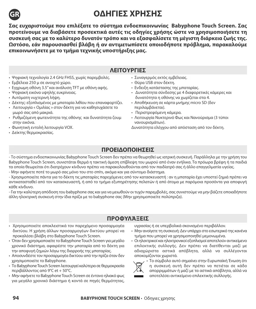 BABYPHONE TOUCH SCREEN • Οδηγιες χρησης
