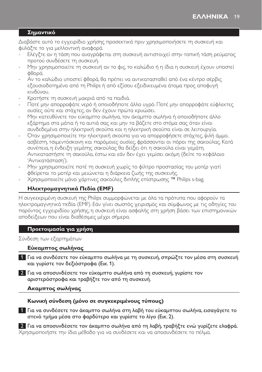 Die Saugleistung ist unzureichend. Überprüfen Sie, ob der Saugleistungsregler auf der höchsten Stufe steht. Möglicherweise ist der Staubbeutel voll. Tauschen Sie den Staubbeutel aus. Möglicherweise sind die Filter verschmutzt. Tauschen Sie die Filter aus. Möglicherweise ist die Düse, das Saugrohr oder der Saugschlauch verstopft. Die Verstopfung können Sie beseitigen, indem Sie - soweit möglich - das betroffene Teil verkehrt herum anschließen. Schalten Sie das Gerät ein, und blasen Sie in der umgekehrten Richtung Luft hindurch (Abb. 31). Ελληνικά 19 Διαβάστε αυτό το εγχειρίδιο χρήσης προσεκτικά πριν χρησιμοποιήσετε τη συσκευή και φυλάξτε το για μελλοντική αναφορά. -- Ελέγξτε αν η τάση που αναγράφεται στη συσκευή αντιστοιχεί στην τοπική τάση ρεύματος προτού συνδέσετε τη συσκευή. -- Μην χρησιμοποιείτε τη συσκευή αν το φις, το καλώδιο ή η ίδια η συσκευή έχουν υποστεί -- Αν το καλώδιο υποστεί φθορά, θα πρέπει να αντικατασταθεί από ένα κέντρο σέρβις εξουσιοδοτημένο από τη Philips ή από εξίσου εξειδικευμένα άτομα προς αποφυγή -- Κρατήστε τη συσκευή μακριά από τα παιδιά. -- Ποτέ μην απορροφάτε νερό ή οποιοδήποτε άλλο υγρό. Ποτέ μην απορροφάτε εύφλεκτες ουσίες ούτε και στάχτες, αν δεν έχουν πρώτα κρυώσει. -- Μην κατευθύνετε τον εύκαμπτο σωλήνα, τον άκαμπτο σωλήνα ή οποιοδήποτε άλλο εξάρτημα στα μάτια ή τα αυτιά σας και μην τα βάζετε στο στόμα σας όταν είναι συνδεδεμένα στην ηλεκτρική σκούπα και η ηλεκτρική σκούπα είναι σε λειτουργία. -- Όταν χρησιμοποιείτε την ηλεκτρική σκούπα για να απορροφήσετε στάχτες, ψιλή άμμο, ασβέστη, τσιμεντόσκονη και παρόμοιες ουσίες, φράσσονται οι πόροι της σακούλας. Κατά συνέπεια, η ένδειξη γεμάτης σακούλας θα δείξει ότι η σακούλα είναι γεμάτη. Αντικαταστήστε τη σακούλα, έστω και εάν δεν έχει γεμίσει ακόμη (δείτε το κεφάλαιο ‘Αντικατάσταση’). -- Μην χρησιμοποιείτε ποτέ τη συσκευή χωρίς το φίλτρο προστασίας του μοτέρ γιατί φθείρεται το μοτέρ και μειώνεται η διάρκεια ζωής της συσκευής. -- Χρησιμοποιείτε μόνο χάρτινες σακούλες διπλής επίστρωσης ` Philips s-bag. Ηλεκτρομαγνητικά Πεδία (EMF) Η συγκεκριμένη συσκευή της Philips συμμορφώνεται με όλα τα πρότυπα που αφορούν τα ηλεκτρομαγνητικά πεδία (EMF). Εάν γίνει σωστός χειρισμός και σύμφωνος με τις οδηγίες του παρόντος εγχειριδίου χρήσης, η συσκευή είναι ασφαλής στη χρήση βάσει των επιστημονικών αποδείξεων που είναι διαθέσιμες μέχρι σήμερα. Προετοιμασία για χρήση Σύνδεση των εξαρτημάτων Εύκαμπτος σωλήνας 1 Για να συνδέσετε τον εύκαμπτο σωλήνα με τη συσκευή, σπρώξτε τον μέσα στη συσκευή και γυρίστε τον δεξιόστροφα (Εικ. 1). 2 Για να αποσυνδέσετε τον εύκαμπτο σωλήνα από τη συσκευή, γυρίστε τον αριστερόστροφα και τραβήξτε τον από τη συσκευή. Ακαμπτος σωλήνας Κωνική σύνδεση (μόνο σε συγκεκριμένους τύπους) 1 Για να συνδέσετε τον άκαμπτο σωλήνα στη λαβή του εύκαμπτου σωλήνα, εισαγάγετε το στενό τμήμα μέσα στο φαρδύτερο και γυρίστε το λίγο (Εικ. 2). 2 Για να αποσυνδέσετε τον άκαμπτο σωλήνα από τη λαβή, τραβήξτε ενώ γυρίζετε ελαφρά. Χρησιμοποιήστε την ίδια μέθοδο για να συνδέσετε και να αποσυνδέσετε το πέλμα.