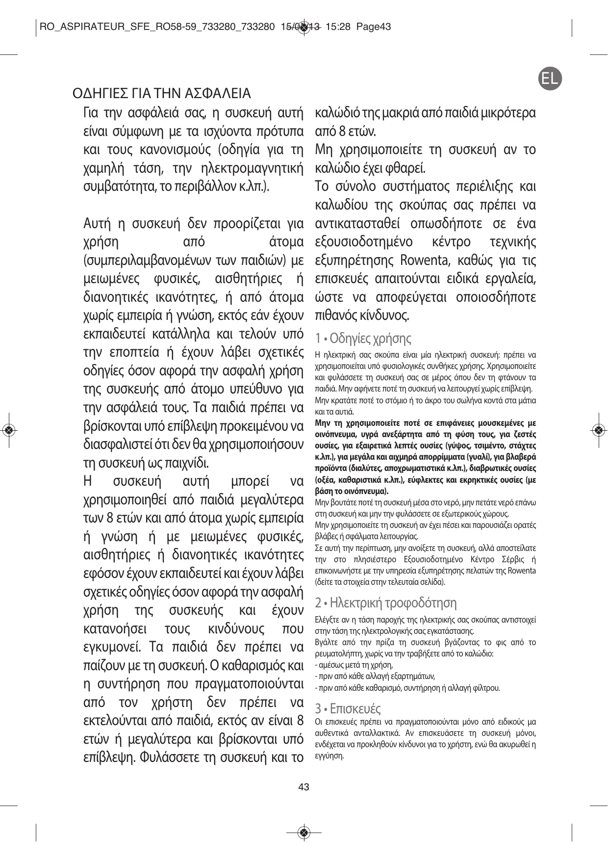 (συμπεριλαμβανομένων των παιδιών) με μειωμένες φυσικές, αισθητήριες ή διανοητικές ικανότητες, ή από άτομα χωρίς εμπειρία ή γνώση, εκτός εάν έχουν εκπαιδευτεί κατάλληλα και τελούν υπό την εποπτεία ή έχουν λάβει σχετικές Η ηλεκτρική σας σκούπα είναι μία ηλεκτρική συσκευή: πρέπει να υπό φυσιολογικές συνθήκες χρήσης. Χρησιμοποιείτε οδηγίες όσον αφορά την ασφαλή χρήση χρησιμοποιείται και φυλάσσετε τη συσκευή σας σε μέρος όπου δεν τη φτάνουν τα της συσκευής από άτομο υπεύθυνο για παιδιά. Μην αφήνετε ποτέ τη συσκευή να λειτουργεί χωρίς επίβλεψη. Μην κρατάτε ποτέ το στόμιο ή το άκρο του σωλήνα κοντά στα μάτια την ασφάλειά τους. Τα παιδιά πρέπει να και τα αυτιά. τη χρησιμοποιείτε ποτέ σε επιφάνειες μουσκεμένες με βρίσκονται υπό επίβλεψη προκειμένου να Μην οινόπνευμα, υγρά ανεξάρτητα από τη φύση τους, για ζεστές διασφαλιστεί ότι δεν θα χρησιμοποιήσουν ουσίες, για εξαιρετικά λεπτές ουσίες (γύψος, τσιμέντο, στάχτες κ.λπ.), για μεγάλα και αιχμηρά απορρίμματα (γυαλί), για βλαβερά τη συσκευή ως παιχνίδι. προϊόντα (διαλύτες, αποχρωματιστικά κ.λπ.), διαβρωτικές ουσίες Η συσκευή αυτή μπορεί να (οξέα, καθαριστικά κ.λπ.), εύφλεκτες και εκρηκτικές ουσίες (με βάση το οινόπνευμα). χρησιμοποιηθεί από παιδιά μεγαλύτερα Μην βουτάτε ποτέ τη συσκευή μέσα στο νερό, μην πετάτε νερό επάνω συσκευή και μην την φυλάσσετε σε εξωτερικούς χώρους. των 8 ετών και από άτομα χωρίς εμπειρία στη Μην χρησιμοποιείτε τη συσκευή αν έχει πέσει και παρουσιάζει ορατές ή γνώση ή με μειωμένες φυσικές, βλάβες ή σφάλματα λειτουργίας. Σε αυτή την περίπτωση, μην ανοίξετε τη συσκευή, αλλά αποστείλατε αισθητήριες ή διανοητικές ικανότητες την στο πλησιέστερο Εξουσιοδοτημένο Κέντρο Σέρβις ή επικοινωνήστε με την υπηρεσία εξυπηρέτησης πελατών της Rowenta εφόσον έχουν εκπαιδευτεί και έχουν λάβει (δείτε τα στοιχεία στην τελευταία σελίδα). σχετικές οδηγίες όσον αφορά την ασφαλή