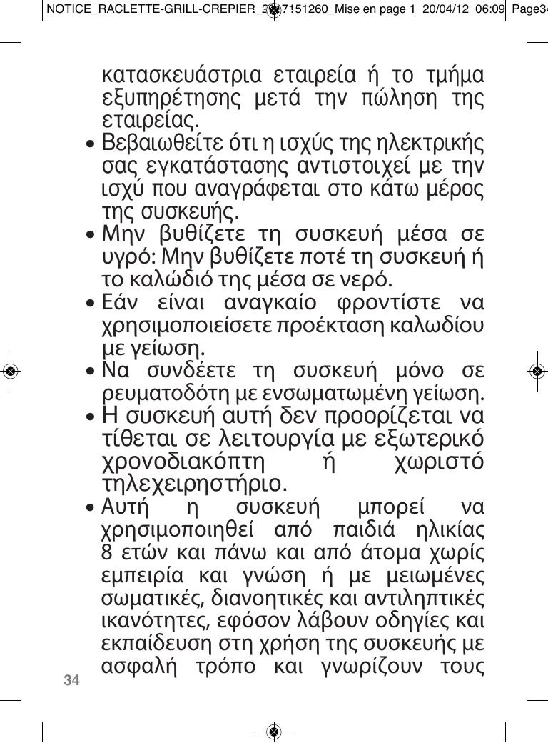 ηٷÛ΢¿ÛÙÚÈ· ÂÙ·ÈÚ›· ‹ ÙÔ Ù̷̋ Â͢ËÚ¤ÙËÛ˘ ÌÂÙ¿ ÙËÓ ÒÏËÛË Ù˘ ÂÙ·ÈÚ›·˜. • μ‚·Èˆı›Ù fiÙÈ Ë ÈÛ¯‡˜ Ù˘ ËÏÂÎÙÚÈ΋˜ Û·˜ ÂÁηٿÛÙ·Û˘ ·ÓÙÈÛÙÔȯ› Ì ÙËÓ ÈÛ¯‡ Ô˘ ·Ó·ÁÚ¿ÊÂÙ·È ÛÙÔ Î¿Ùˆ ̤ÚÔ˜ Ù˘ Û˘Û΢‹˜. • Μην βυθίζετε τη συσκευή μέσα σε υγρό: Μην βυθίζετε ποτέ τη συσκευή ή το καλώδιό της μέσα σε νερό. • Εάν είναι αναγκαίο φροντίστε να χρησιμοποιείσετε προέκταση καλωδίου με γείωση. • Να συνδέετε τη συσκευή μόνο σε ρευματοδότη με ενσωματωμένη γείωση. • ∏ Û˘Û΢‹ ·˘Ù‹ ‰ÂÓ ÚÔÔÚ›˙ÂÙ·È Ó· Ù›ıÂÙ·È Û ÏÂÈÙÔ˘ÚÁ›· Ì Â͈ÙÂÚÈÎfi ¯ÚÔÓԉȷÎfiÙË ‹ ¯ˆÚÈÛÙfi ÙËϯÂÈÚËÛÙ‹ÚÈÔ. • Αυτή η συσκευή μπορεί να χρησιμοποιηθεί από παιδιά ηλικίας 8 ετών και πάνω και από άτομα χωρίς εμπειρία και γνώση ή με μειωμένες σωματικές, διανοητικές και αντιληπτικές ικανότητες, εφόσον λάβουν οδηγίες και εκπαίδευση στη χρήση της συσκευής με ασφαλή τρόπο και γνωρίζουν τους 34